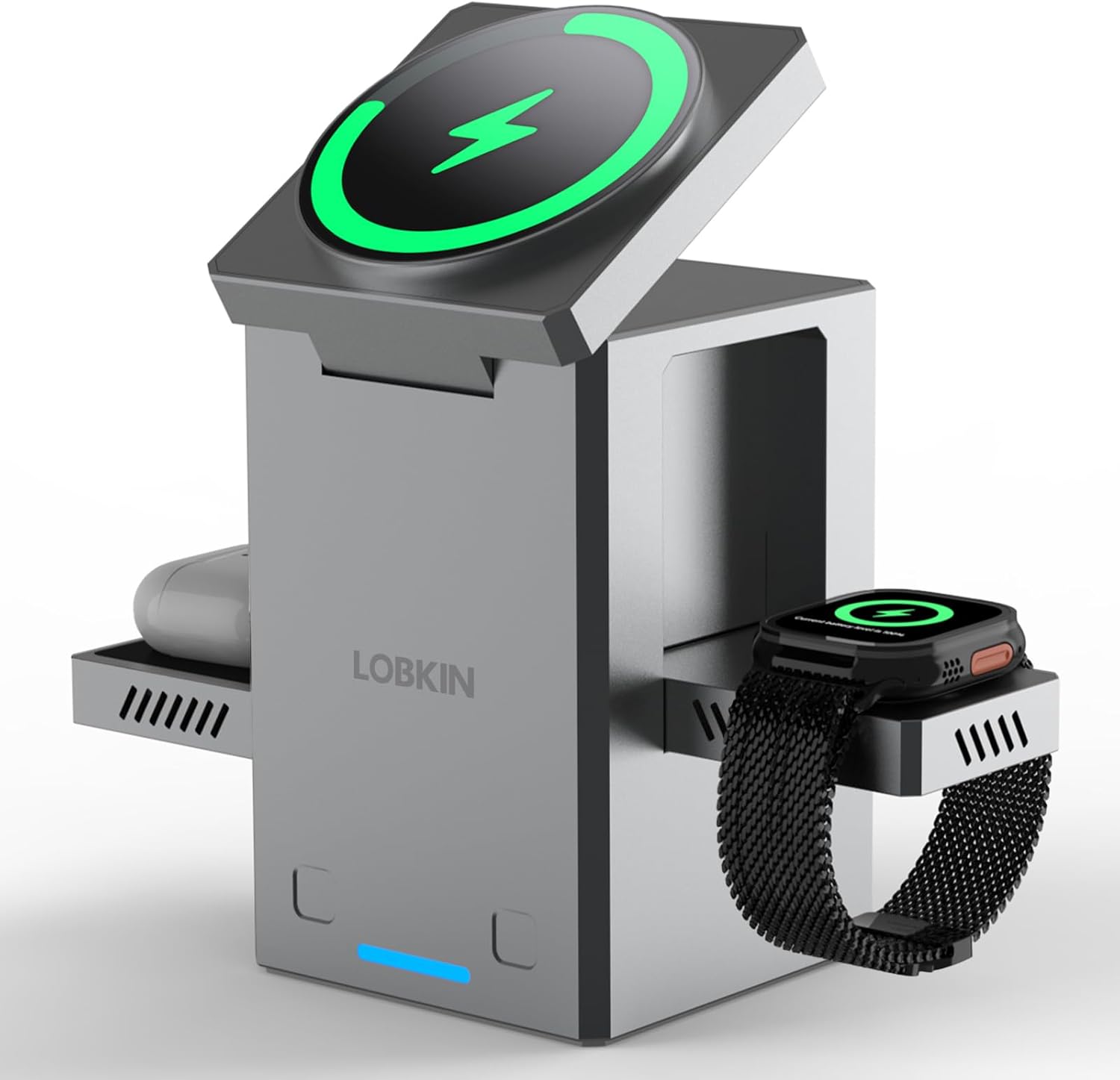 LOBKIN 3 in 1 Charging Station, Qi2 15W Foldable Intelligent Fast Wireless Charging Station,MagSafe Charger Stand for iPhone 16/15/14/13, Airpods, Apple Watch