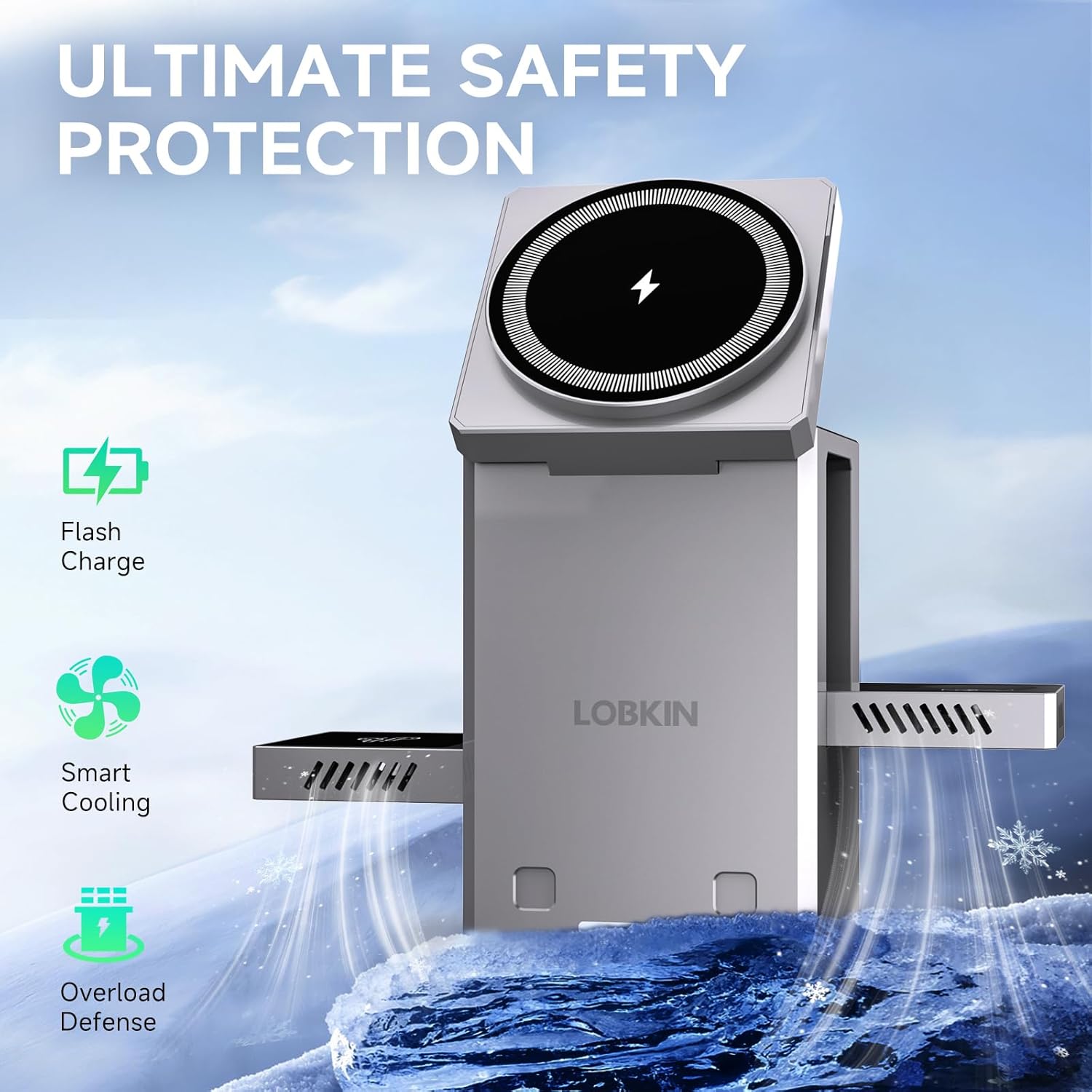 - Qi2 15W Wireless Fast Charging: LOBKIN Qi2-certified 3 in 1 charging station delivers up to 15W fast wireless charging for your phone. With smart power distribution and built-in protection against overheating, overcurrent, and short circuits, it ensures safe, efficient, and reliable charging for all your Qi-enabled devices.