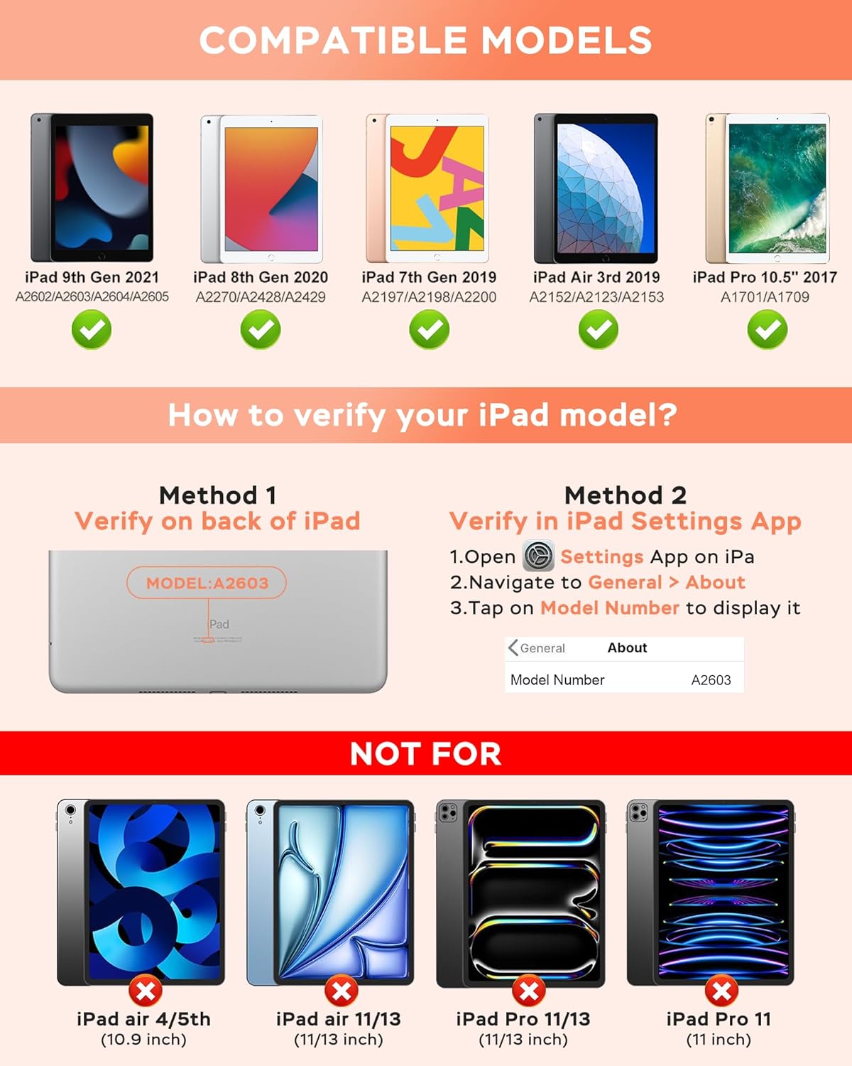 - ăFor ipad Case with Keyboard 10.2/10.5 InchăThis keyboard case compatible with iPad 9th Generation 10.2inch 2021(Model Number:A2602/A2603/A2604/A2605), compatible with iPad 8th Generation 10.2inch 2020(Model Number:A2270/A2428/A2429/A2430), compatible with iPad 7th Generation 10.2inch 2019(Model Number:A2200/A2197/A2198), compatible with iPad Air 3rd Generation 10.5inch 2019(Model Number:A2123/A2152/A2153/A2154) and compatible with iPad Pro 10.5inch 2017(Model Number: A1701/A1709/A1852). Please check the model number starting with "A" on the back of your tablet before purchasing