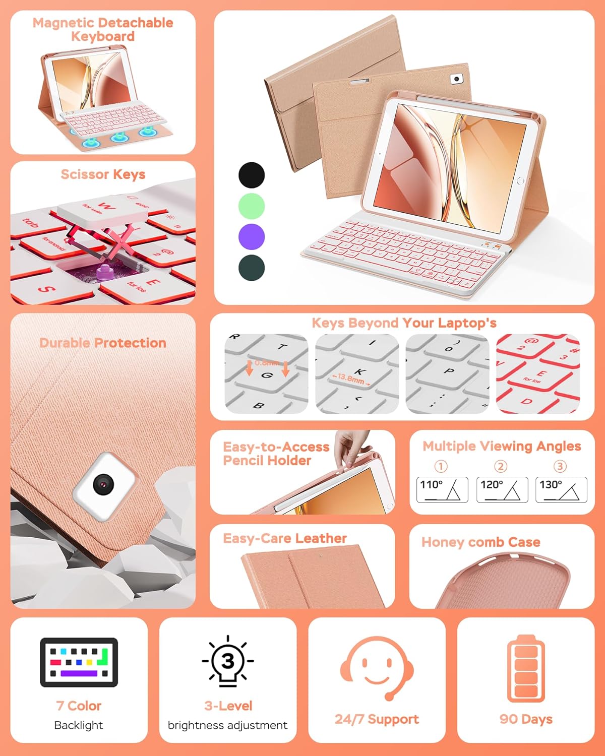 Keyboard Case for iPad 9th 8th 7th Generation Case 10.2" - 7 Colors Backlit Detachable Folio Keyboard Cover with Pencil Holder for iPad Pro 10.5" / iPad Air 3rd Gen (Pink)