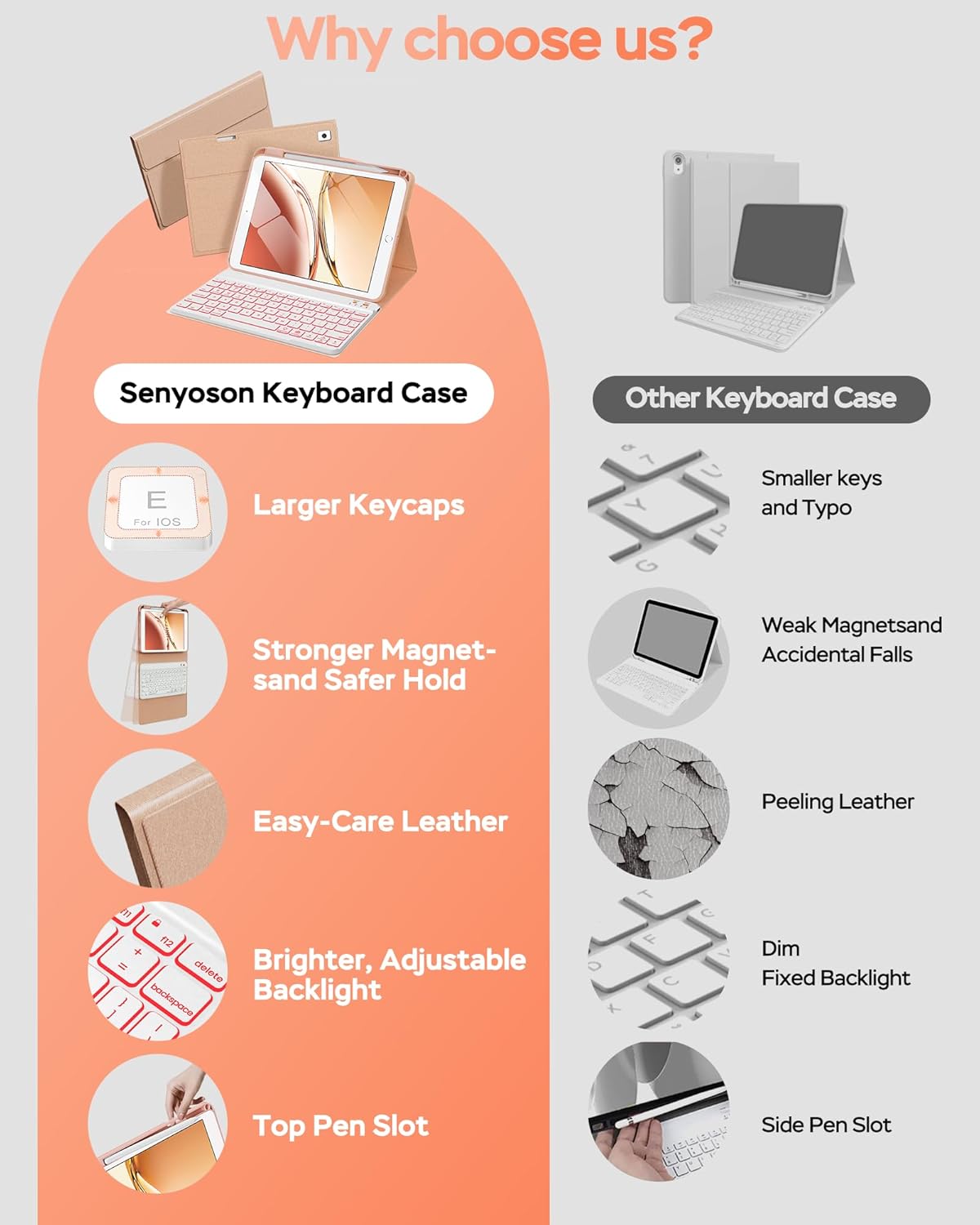 - ăPremium MaterialăSenyoson for ipad keyboard case is made of good quality PU. Soft, smooth and it gives a luxurious feeling. The interior case is made of high-quality flexible TPU with honeycomb heat dissipation. Keyboard case can protect your tablet from drops and scratches. Precise cutout allows full access to all ports, sensors, speaker, microphone and camera