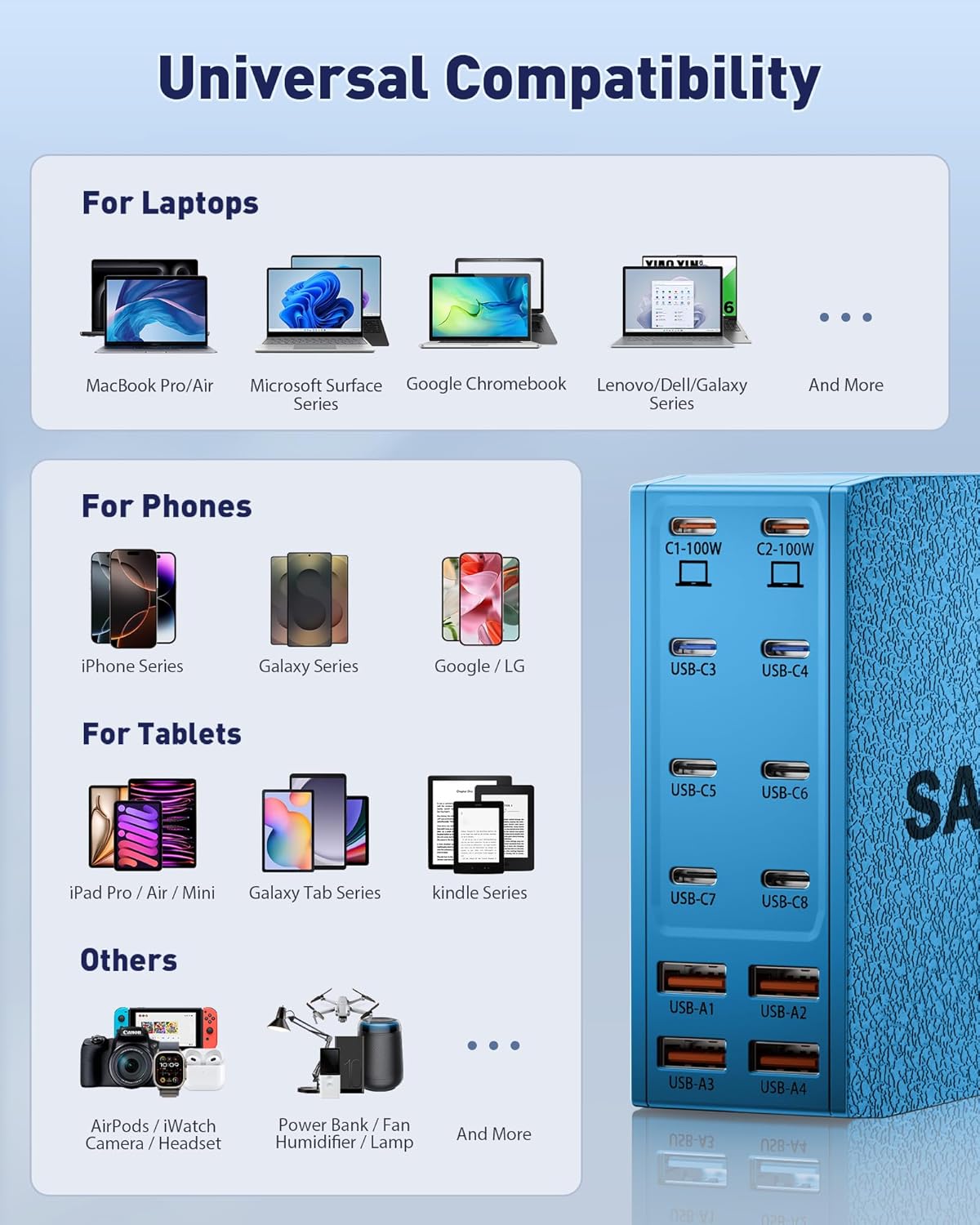 - ăUniversal CompatibilityăOur USB C charging station is equipped with 2*100W and 2*65W fast charging ports, which can charge 3 or more laptops at the same time. Compatible with smartphones, tablets and laptops, suitable for MacBook Pro/Air, Dell XPS, iPad Pro, iPhone 16/16 Pro Max, iPhone 15 Pro Max, iPhone 14/13 Pro/12 Pro Max, iWatch, AirPods, Surface Pro, Galaxy S24 Ultra, Switch, Steam Deck, Google Pixel and many other devices.