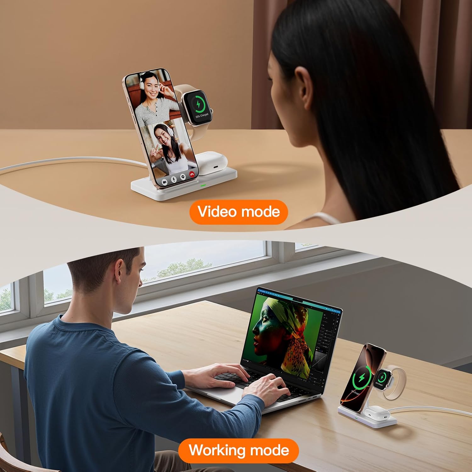 - 【Wide range of compatibility】: Wireless charger phone charging position is no magnetic suction function, but supports wireless-enabled charging devices, it applies to iPhone 16/15/14/13/13/12/11/13/12Mini/Pro/Pro Max/XS/XR/XS MAX/X/8/Plus/And-roid Samsung series (note that only wireless charging devices are supported); Watches and headphones are only supported on i Phone models for iWatch 10/9/8/7/6/5/4/3/2/SE/Ultra/Ultra 2 and Air Pods 2/3/4/Pro/Pro 2 (note: Air Pods are only compatible with wireless charging cases)