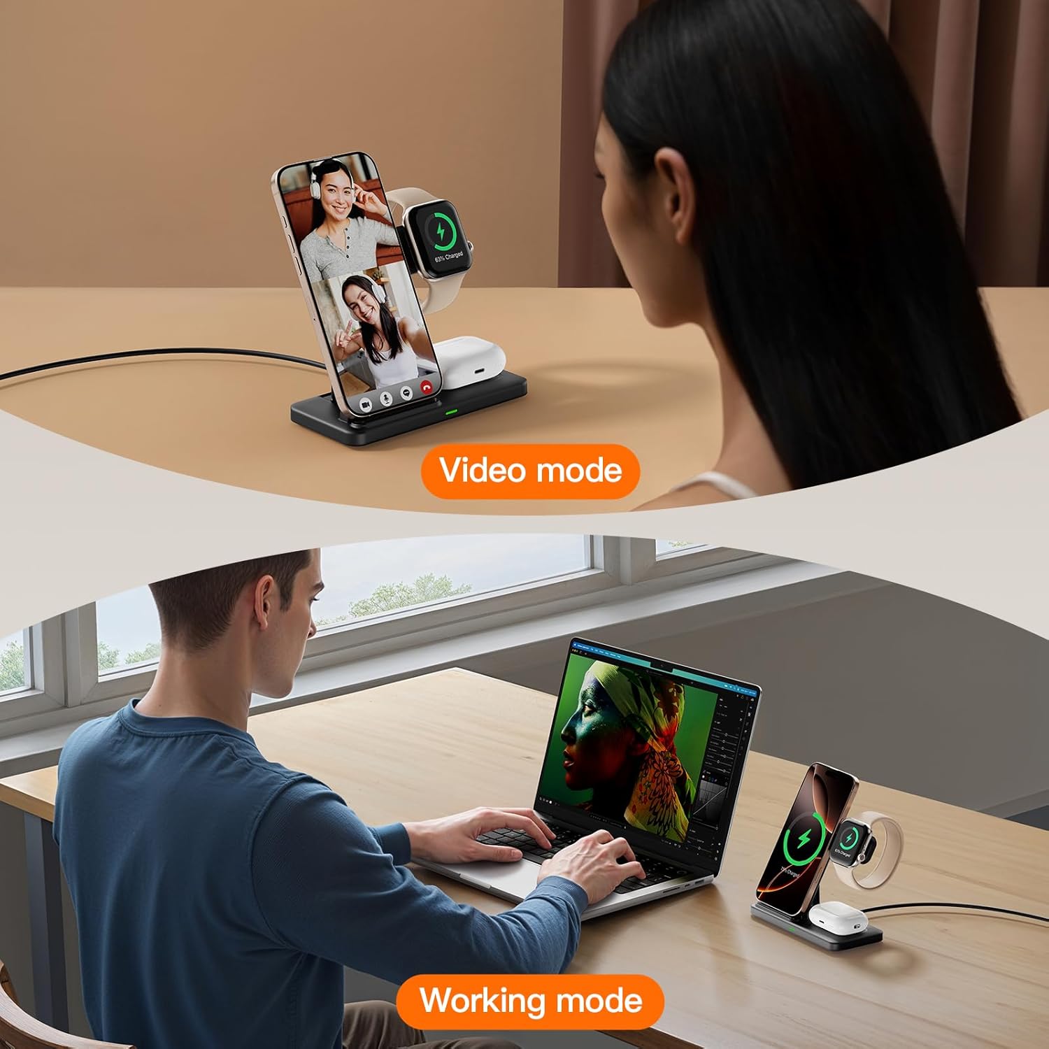 - 【Wide range of compatibility】: Wireless charger phone charging position is no magnetic suction function, but supports wireless-enabled charging devices, it applies to iPhone 16/15/14/13/13/12/11/13/12Mini/Pro/Pro Max/XS/XR/XS MAX/X/8/Plus/And-roid Samsung series (note that only wireless charging devices are supported); Watches and headphones are only supported on i Phone models for iWatch 10/9/8/7/6/5/4/3/2/SE/Ultra/Ultra 2 and Air Pods 2/3/4/Pro/Pro 2 (note: Air Pods are only compatible with wireless charging cases)