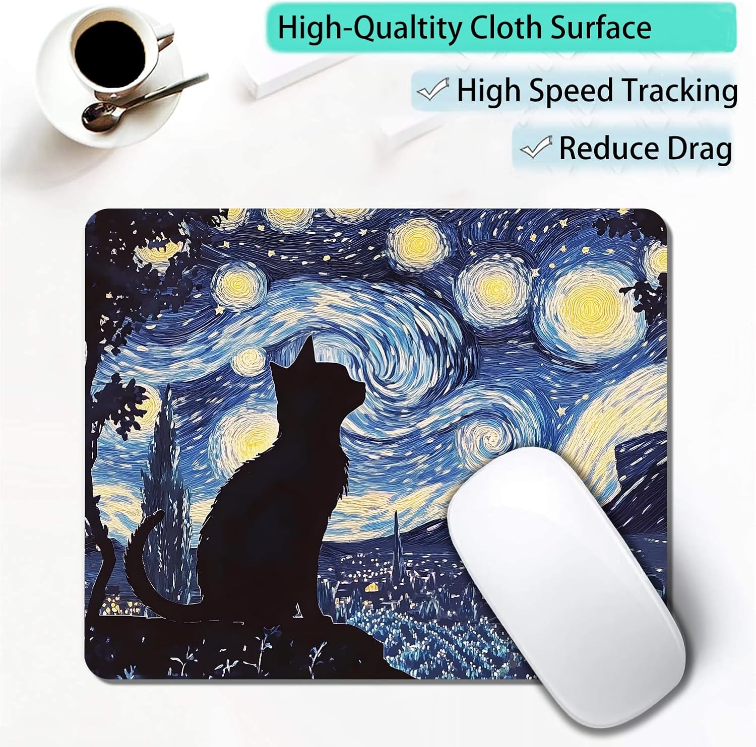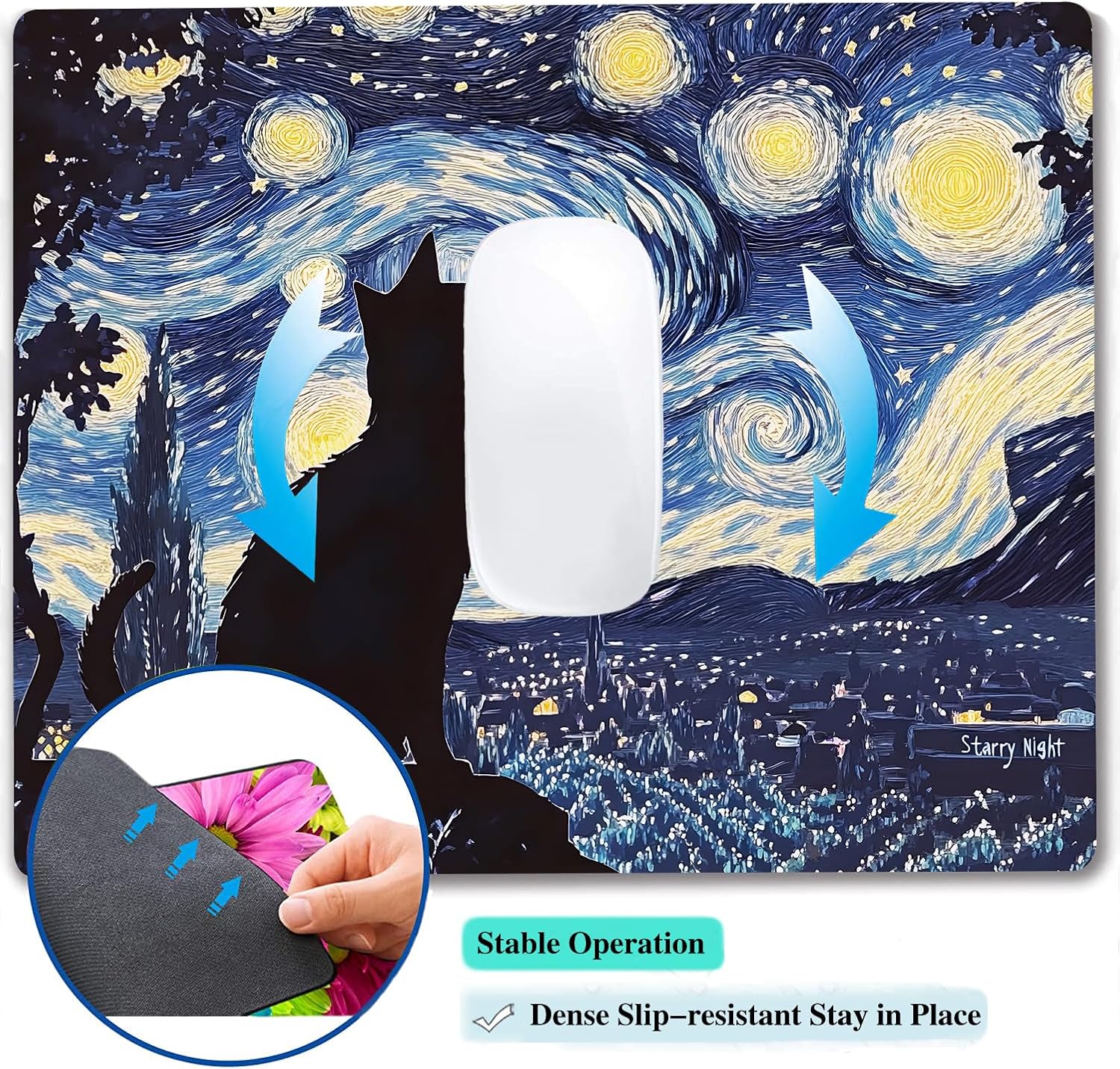 Starry Night Black Cat Custom Mouse Pad with Non-Slip Rubber, Small Square Design for Wireless Laptop & Computer Mouse Pads for Desk, 9.5 x 7.9 inch Smooth Surface for Gaming & Office