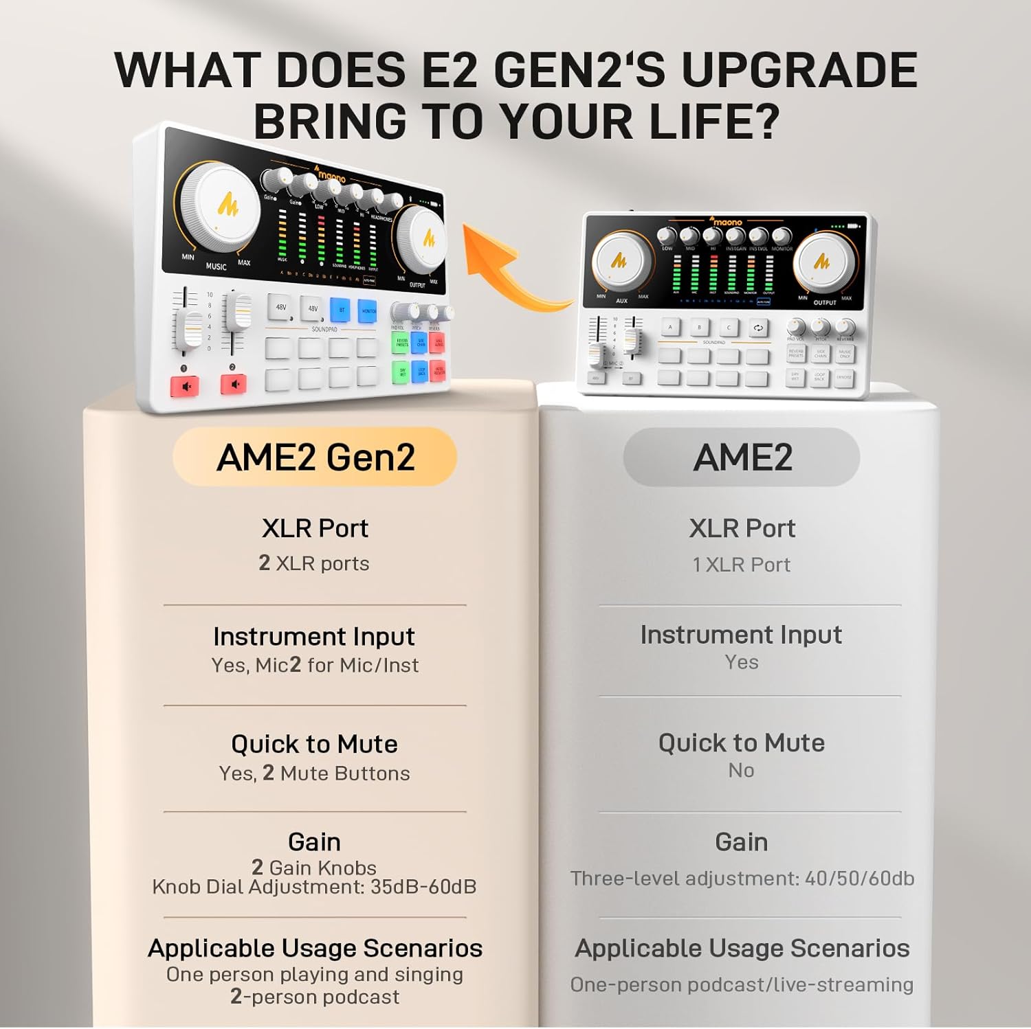 - Crystal-Clear Audio with XLR Interface: The E2 Gen2 podcast interface has two premium and low-noise preamps, delivering up to 60dB of gain. This ensures you get rich, clean sound even when using dynamic microphones. Whether you're a beginner or a pro, the E2 gen2 eliminates needing an external preamp. Noise reduction technology keeps unwanted sounds like fan noise away, so your podcast recordings stay pristine