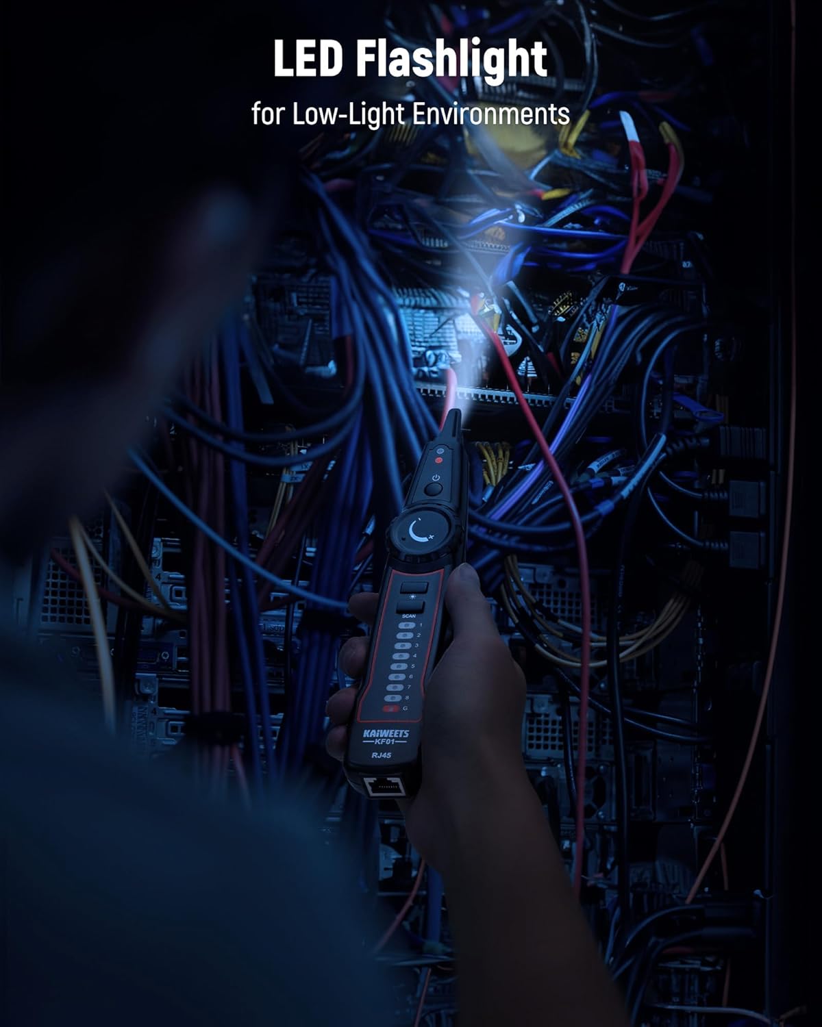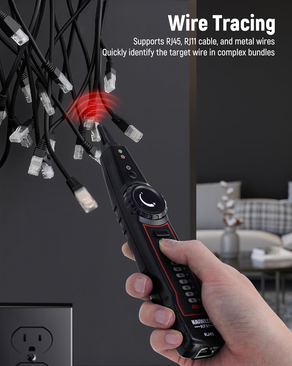 - Versatile Wire Tracing: Quickly identify and trace the target cable from a bundle without damaging the insulation—ideal for locating RJ11 and RJ45 cables. It also supports tracing other metal wires, such as electrical and speaker lines, using the included alligator clip adapter. Note: Be sure to power off the cable before tracing metal wires to avoid damaging the device