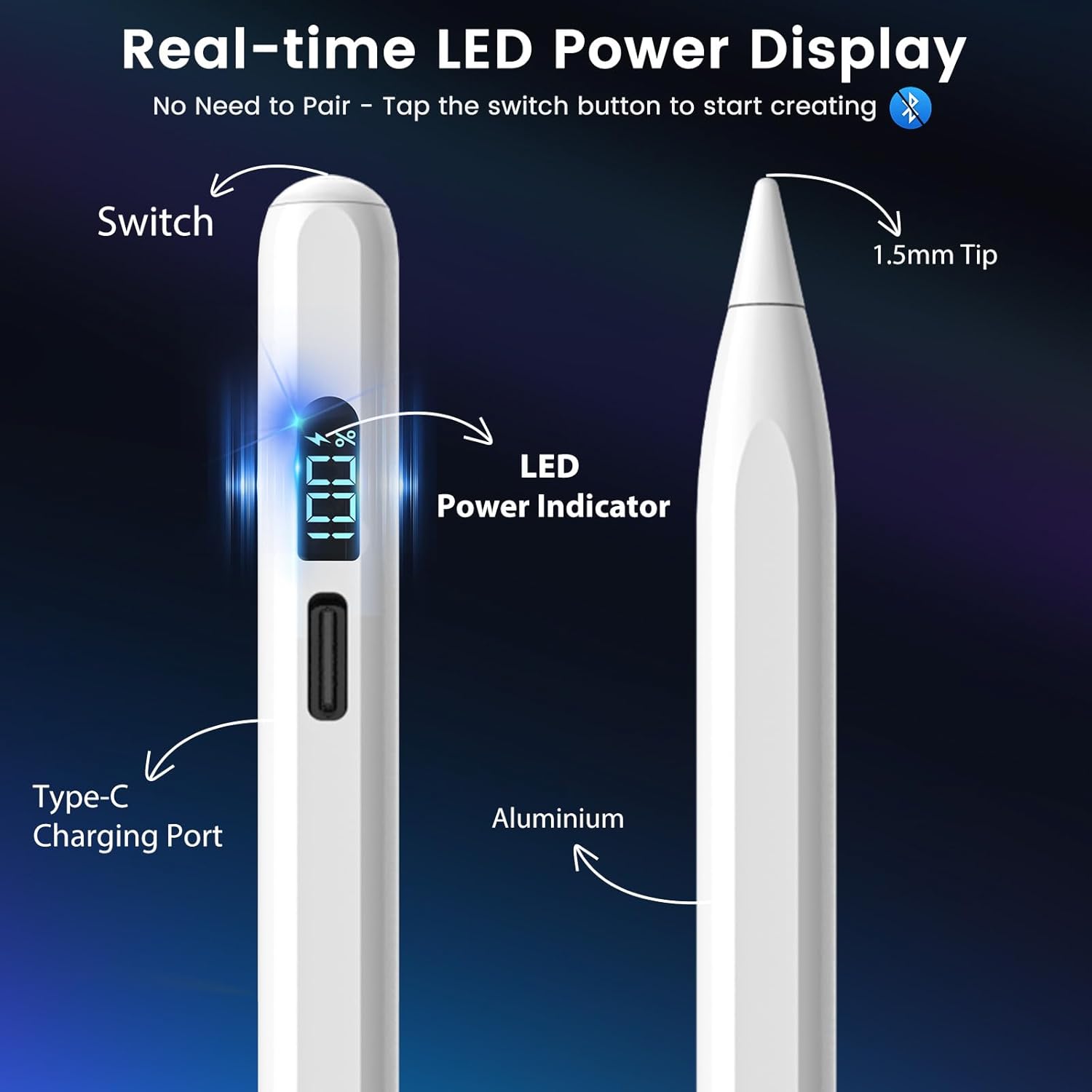 Stylus Pen for iPad M3/M4/9/10th Generation, LED Display Fast Charge Pencil Compatible with Apple iPad Pro A16 6th/7th/8th, Air 5/4/3, Mini 7/6/5(Tilt Sensitivity, Pixel Precision, Palm Rejection)