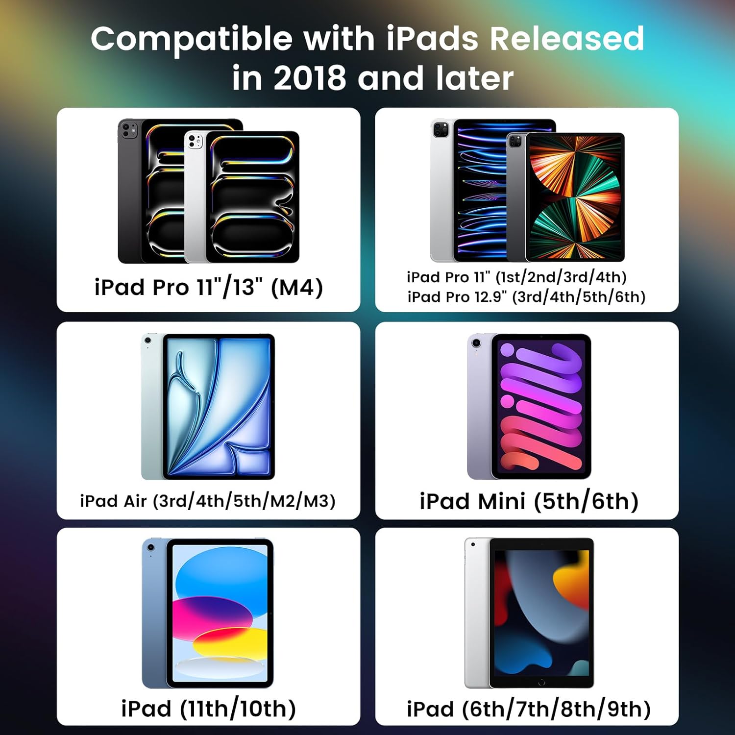 - Compatible Devices : iPad Pro 11/12.9in, iPad 6/7/8/9/10, iPad Air 3/4/5, iPad Mini 5/6, 2024 iPad Pro M4, iPad Air M2(all 2018-2025 models) iPad Pro 11/12.9in, iPad 6/7/8/9/10, iPad Air 3/4/5, iPad Mini 5/6, 2024 iPad Pro M4, iPad Air M2(all 2018-2025 models)
