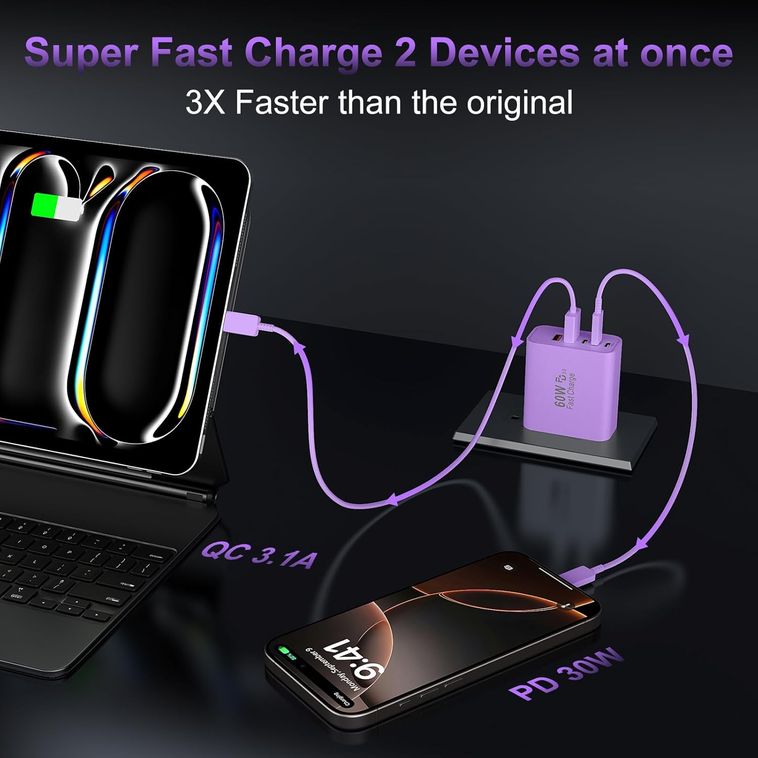 USB C Fast Wall Charger Block, 2Pack 60W USBC Charging Cubes, 5-Port PD+QC Power Adapter Multiport Brick Type C Box Plug for Phone 16/15/14/13/12/11/Pro Max/Plus, Pad Mini/Pro/S25/S24-Purple
