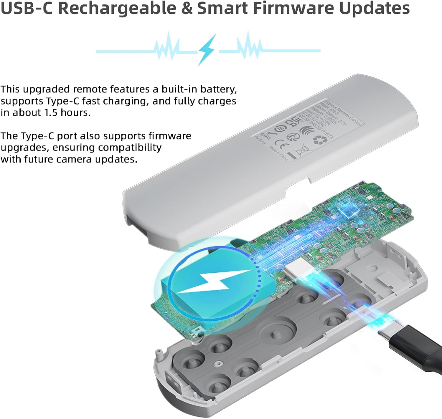- OLED Screen Camera Remote: :Features an OLED screen for clear visualization of operational status, settings, battery level, and Bluetooth pairing information. Provides immediate confirmation of commands and current configuration.
