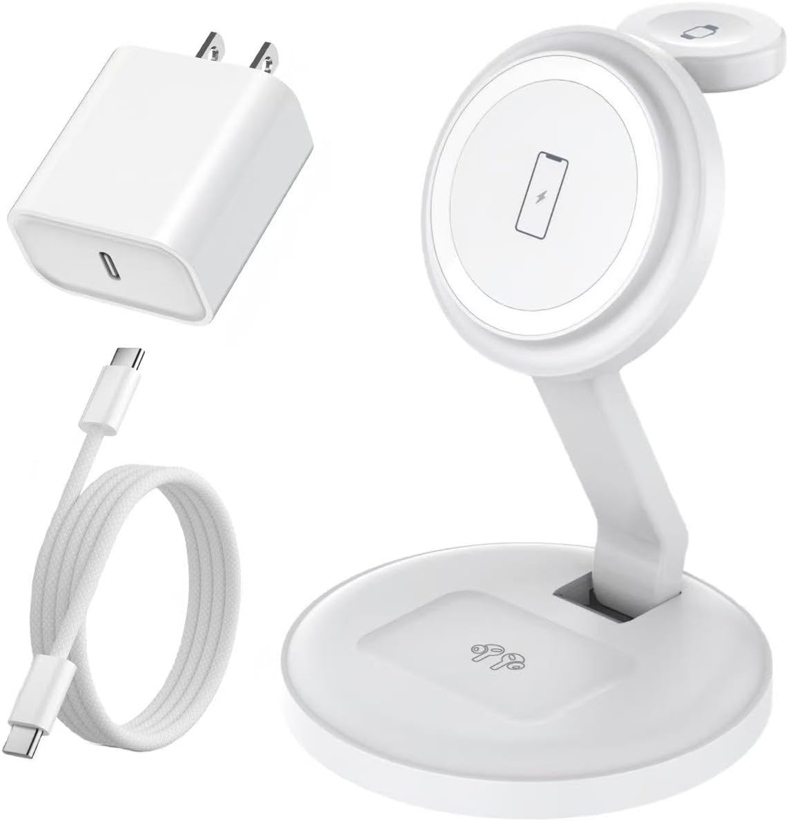 - 3 in 1 Magsafe Charger Stand: This white iphone charger stand with a plug and cable can charge three devices simultaneously. Equipped with a strong magnetic attraction, it allows you to charge your iPhone, Apple Watch, and AirPods at the same time,saving you time.Magsafe charging station supports:iPhone 16/15/14/13/12/11/8 Pro Max/Mini/Plus/X/XR/XS¡Apple Watch Series 10/9/8/7/6/5/4/3/2/SE/Ultra¡AirPods 2/3/4/Pro 2