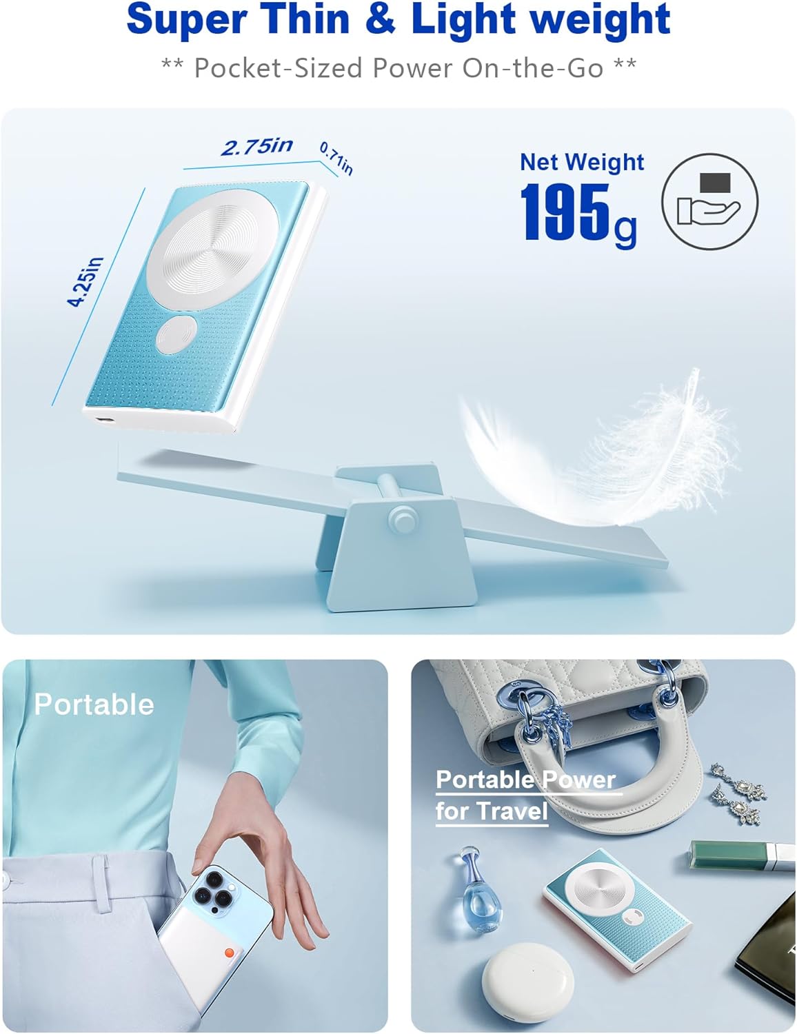 - Perfect Size for On-the-Go: This power bank measures just 4.2×2.7×0.7 inches and weighs only 0.43lbs—lighter than most wallets. The ultra-slim design effortlessly fits in pockets or bags, making it the perfect charging partner for business trips, daily commutes, and travel adventures.