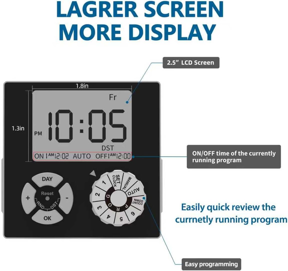 - 【Daily Repeating Light Timer】: 48 ON/OFF setting options in 24 hours; each pins means 30 minutes interval; daily repeat your setting.