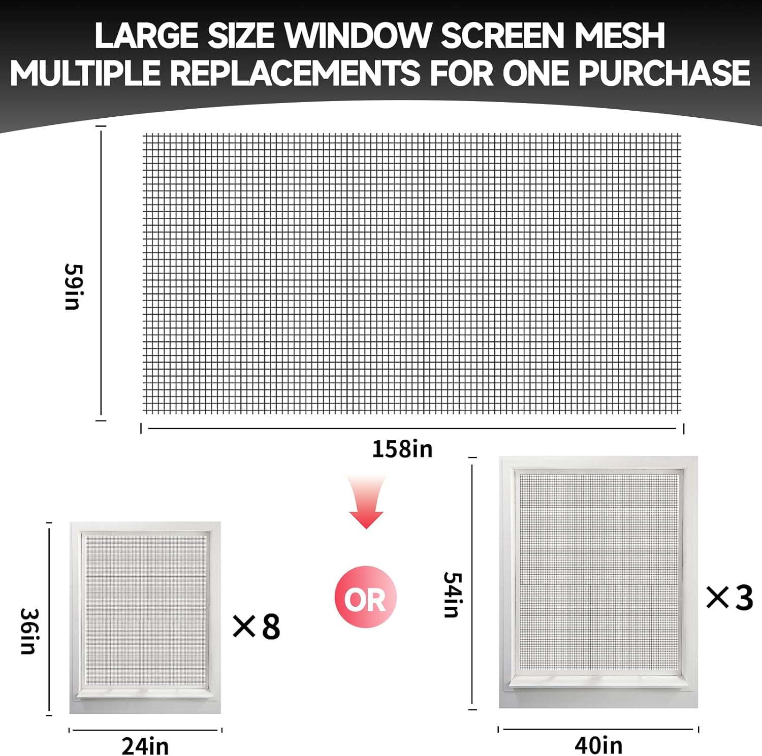 - 【Adjustable window screen】59 x 158 inch Extra-large door and window screen replacement mesh,you can cut the mesh to the desired shape and size as needed. It can easily meet the needs of various scenarios, such as window screens, door screens, courtyard screens, balcony screens, garden screens, porch screens, patio screens and RV screens