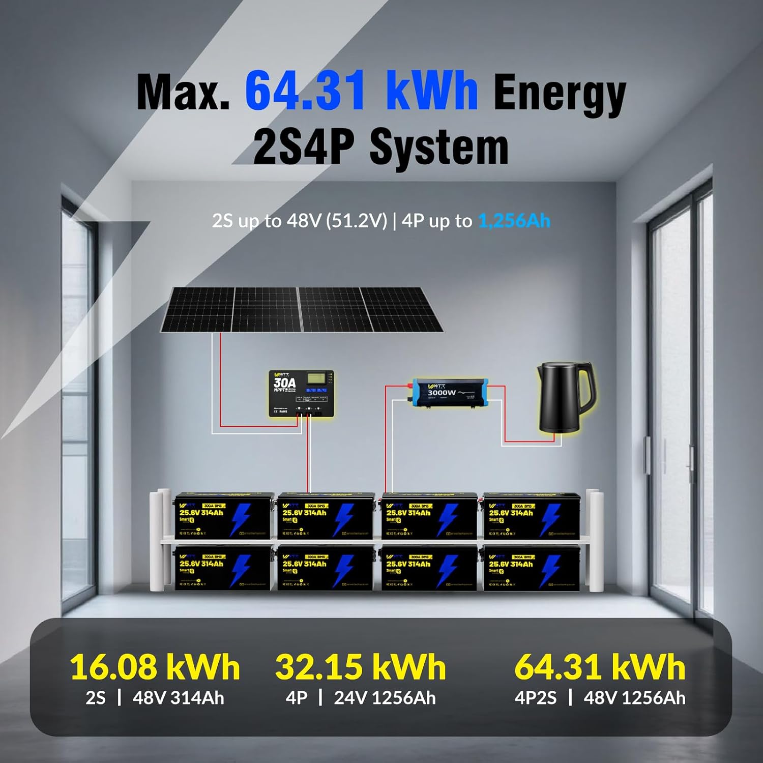 - 【Flexible Expansion】 The WattCycle 24V 314Ah lithium battery delivers 8038Wh of energy and supports up to 4p2s, providing 1256Ah at 48V — an excellent choice for RVs, offering long-lasting power for your journeys. It also supports up to 4 in series, making it ideal for 48V solar power systems