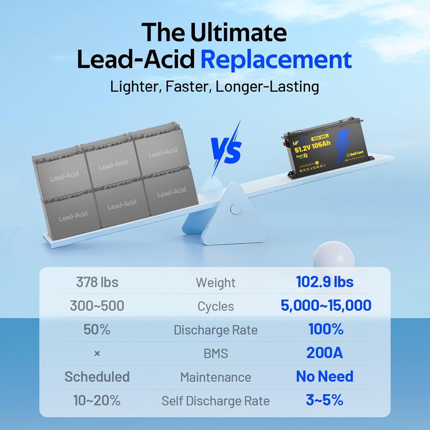 48V(51.2V) 105Ah LiFePO4 Lithium Battery for Golf Cart, Built-in Bluetooth & LCD Display, 200A BMS, Range of 70 Miles 15000+ Deep Cycles LiFePO4 Lithium Batterys
