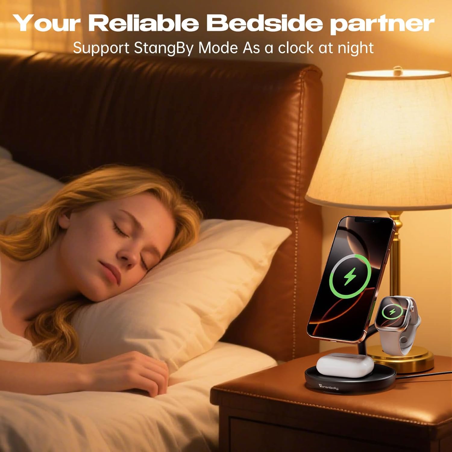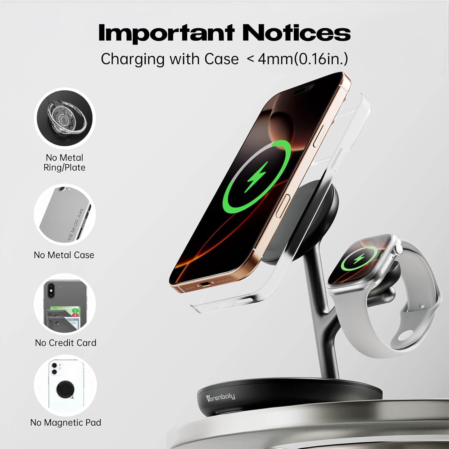 - Full Protection Magnetic Phone charger for iphone & for Apple watch charger stand. The Vorenboly Magnetic Wireless charger for iPhone is CE ROHS FCC certified, with the lastest smart chip,upgraded coils, strong magnetic suction, It dissipates heat quickly and effectively improves charging speed. The over-charge, over-voltage, over-heating protection, foreign object detection functions make charging your devices safely and conveniently. The durable materials enhance the longevity and sturdiness of this phone charger stand.