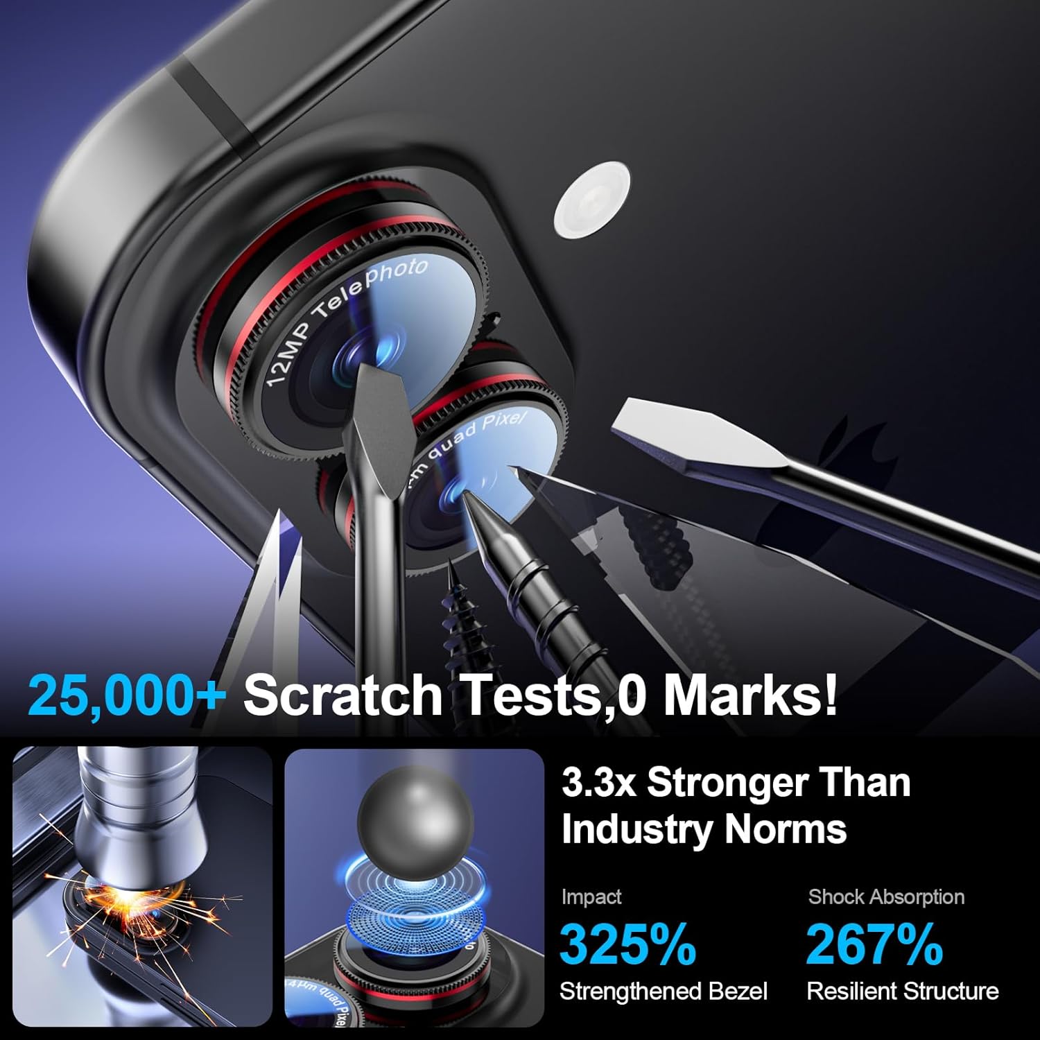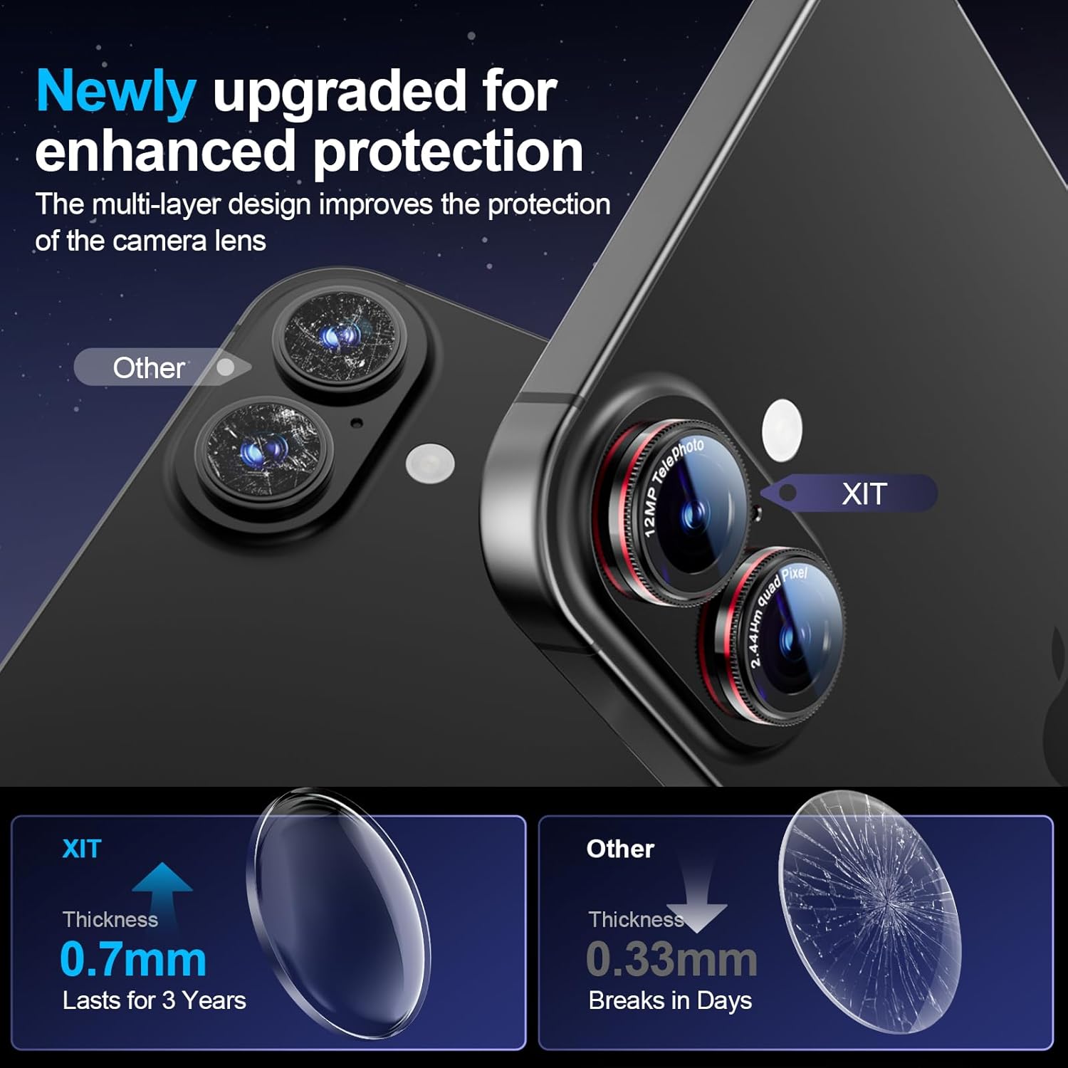 - ✅【Shatterproof Camera Lens Protector for Extreme Adventures】Featuring reinforced titanium alloy edges and a 12KG solid crimping process, this iPhone 16 Plus/iPhone 16 lens protector offers military-grade drop and shock resistance. Its abrasion resistance is 3.3 times stronger than industry standards, making it perfect for hiking, skiing or beach trips. Your iPhone lens stays safe from sand, rocks, and accidental drops
