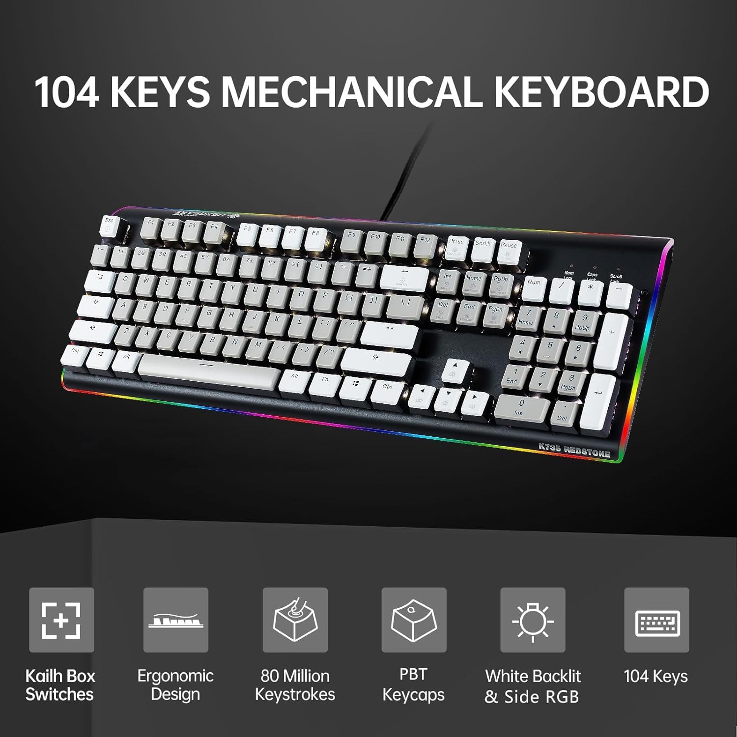 - š¢ Full-Size Dominance - 104 keys Full Mechanical Keyboard with numpad tackle spreadsheets/macros rapidly. Grey/white floating keycaps avoiding the monotony of all-black designs, featuring PBT double-shot keycaps resist oil shine. Delivers tactile confidence to accountants/programmers battling for uncompromised efficiency.