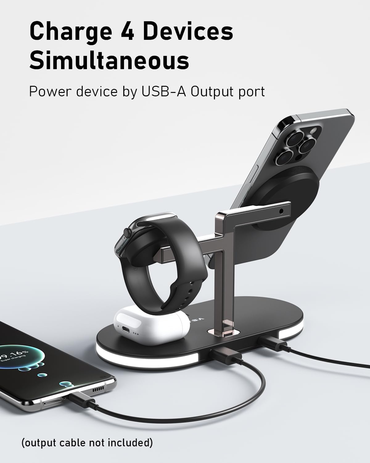 - 【4-in-1 Charging station for Apple Devices】 This magnetic wireless charger station can charge your iPhone,Apple watch and AirPods simultaneously. Meanwhile,the back USB-A output port lets you plug in a cable to power a fourth device (Android phones or any USB gadget). Compact and space-saving design,keep your desk neat and organized,clutter-free solution for your Apple devices.