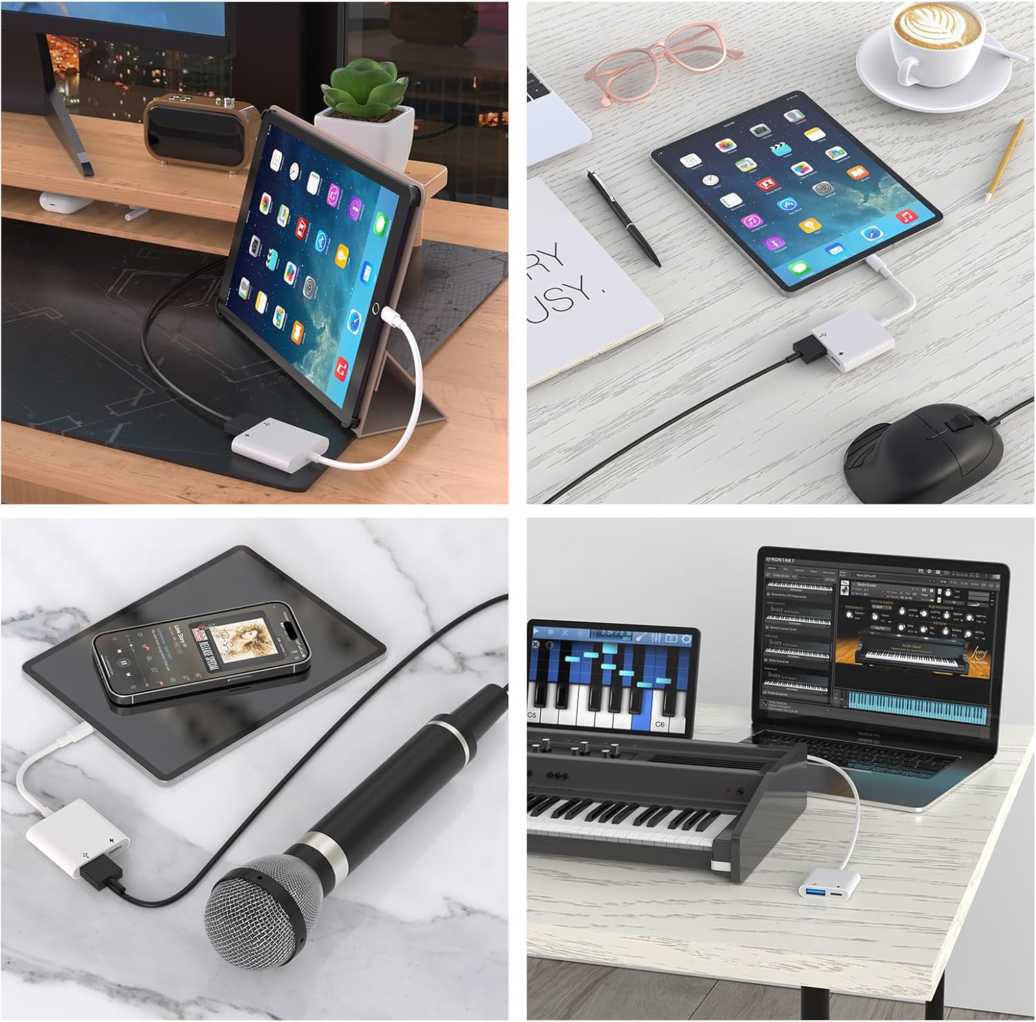- 【Excellent Office Performance】 This iPhone to USB adapter light and reliable, short cable, better performance.with ipad to usb adapter, you can directly plug the PC keyboard or mouse into the ipad,improving your typing speed and productivity. This iPhone to USB adapter supports Hard disk drive, other USB peripherals like hubs/USB flash drives/cameras/guitars/microphones/MIDI keyboards/digital pianos/mouse, etc
