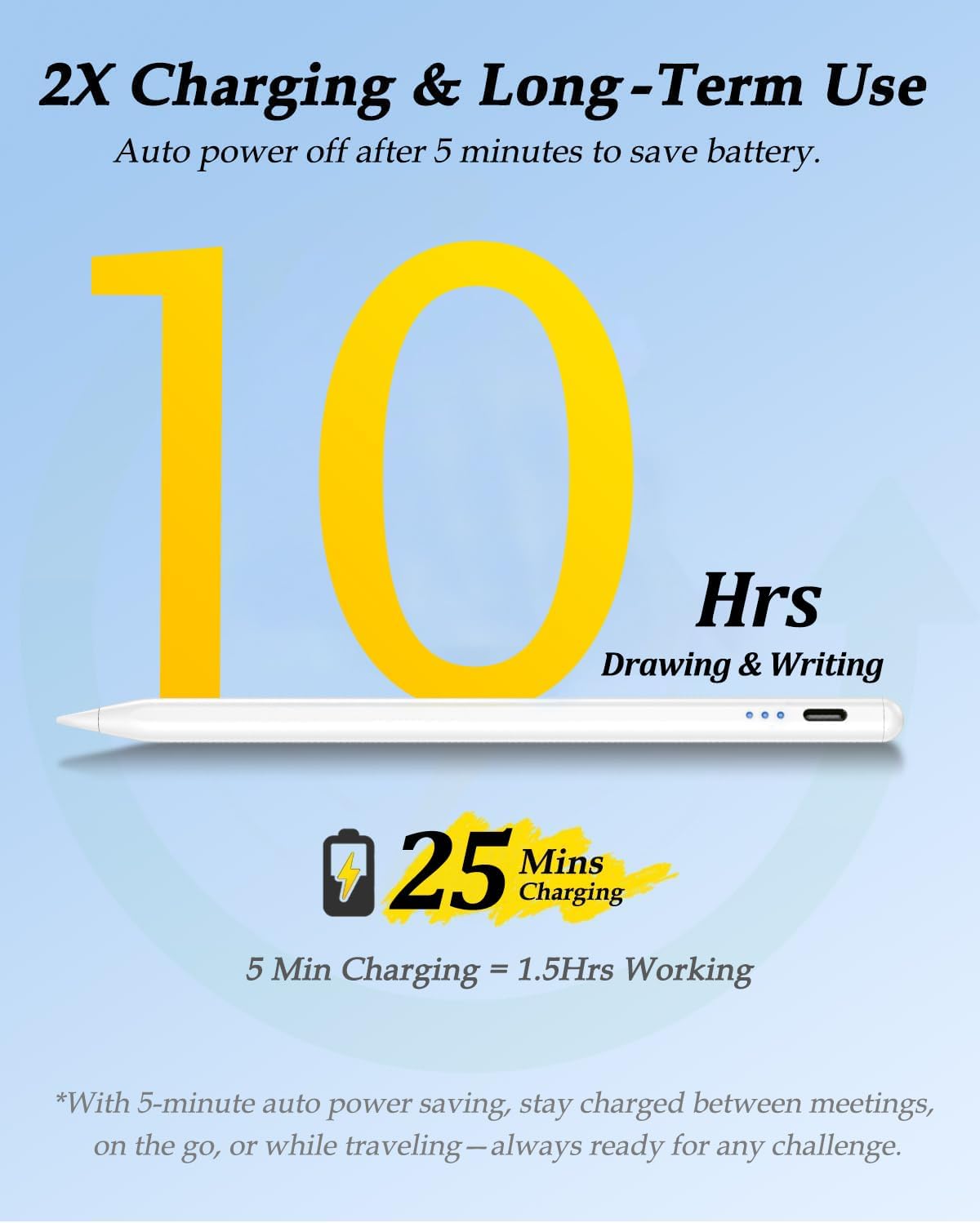 - 🖊【Touch Activated & Type-C Fast Charge】Easy to Use No Pairing Needed,Double-click the top of the ipad stylus to turn on/off easily without connecting Bluetooth.Stylus Pen with the USB-C charging port and fully in 25mins and allows 10 hours of continuous use,auto"sleep mode"after 5 mins of inactivity help conserve battery power