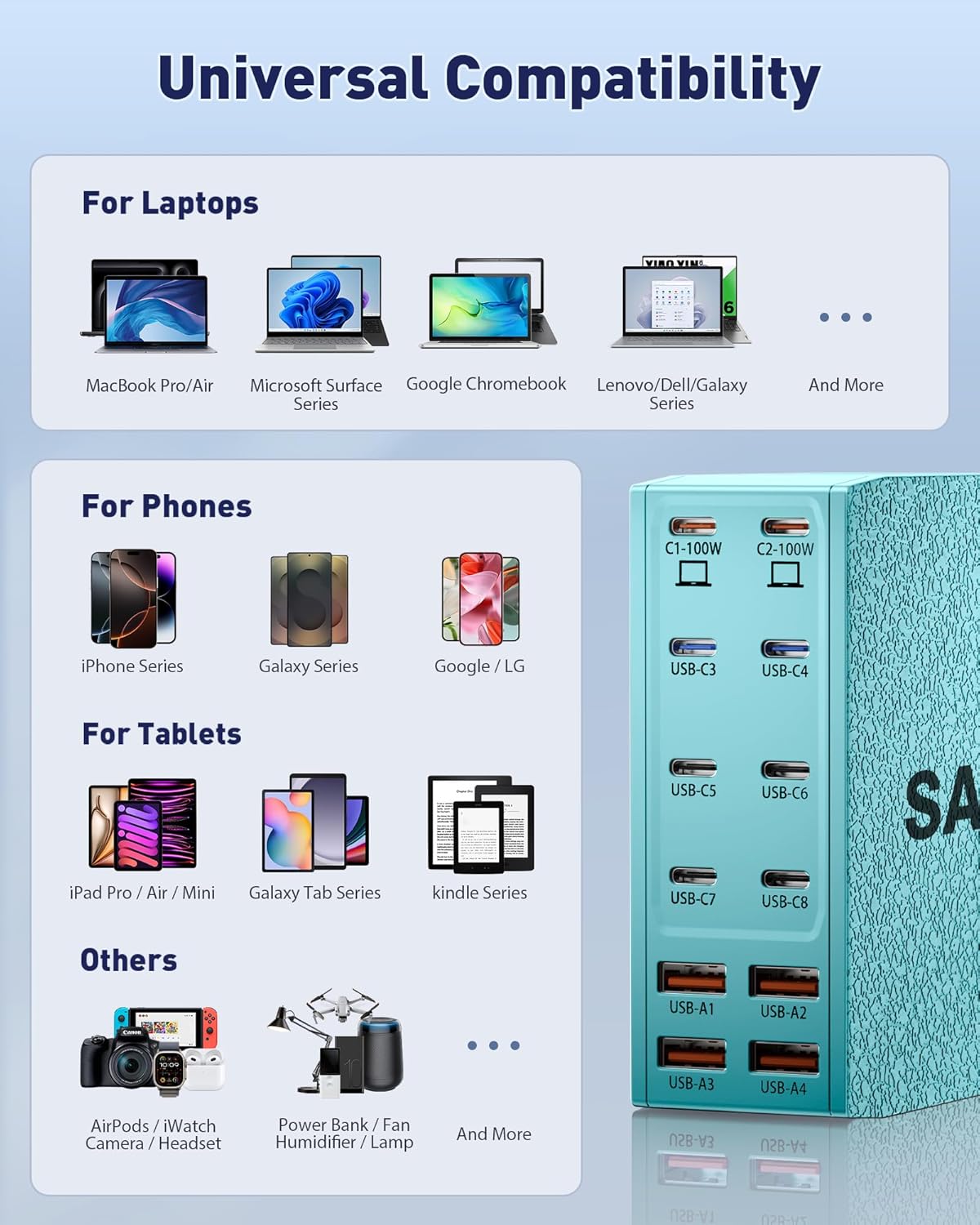 - ăUniversal CompatibilityăOur USB C charging station is equipped with 2*100W and 2*65W fast charging ports, which can charge 3 or more laptops at the same time. Compatible with smartphones, tablets and laptops, suitable for MacBook Pro/Air, Dell XPS, iPad Pro, iPhone 16/16 Pro Max, iPhone 15 Pro Max, iPhone 14/13 Pro/12 Pro Max, iWatch, AirPods, Surface Pro, Galaxy S24 Ultra, Switch, Steam Deck, Google Pixel and many other devices.