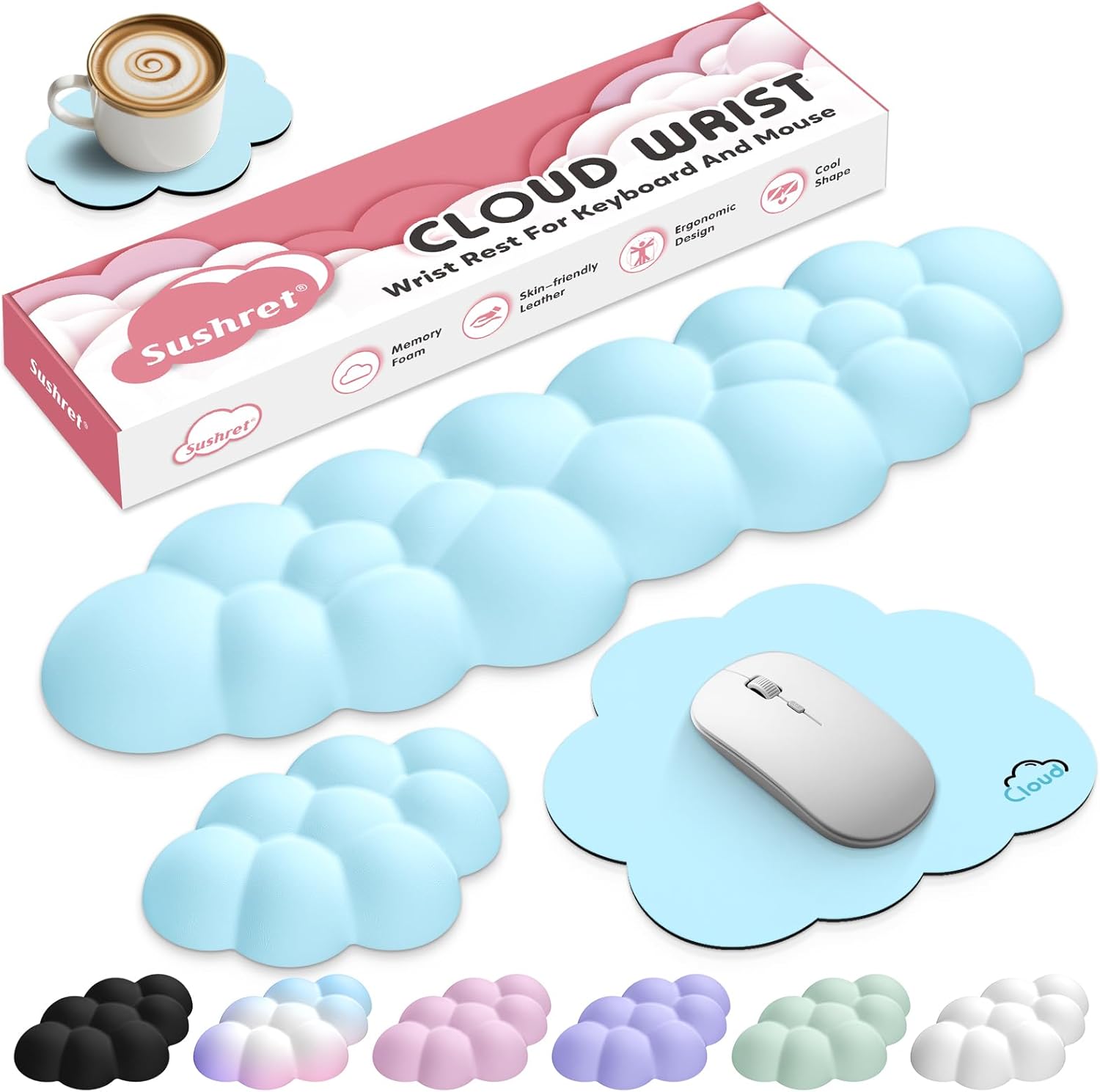 - 4-in-1 Cute Desk Accessory Set: Includes a keyboard wrist rest, mouse wrist rest , mouse pad, and a matching cloud coaster. This complete four-piece set offers ergonomic comfort and comes in a stylish gift box, making it suitable for desktop and laptop setups—whether for gaming, home office, or as a thoughtful gift