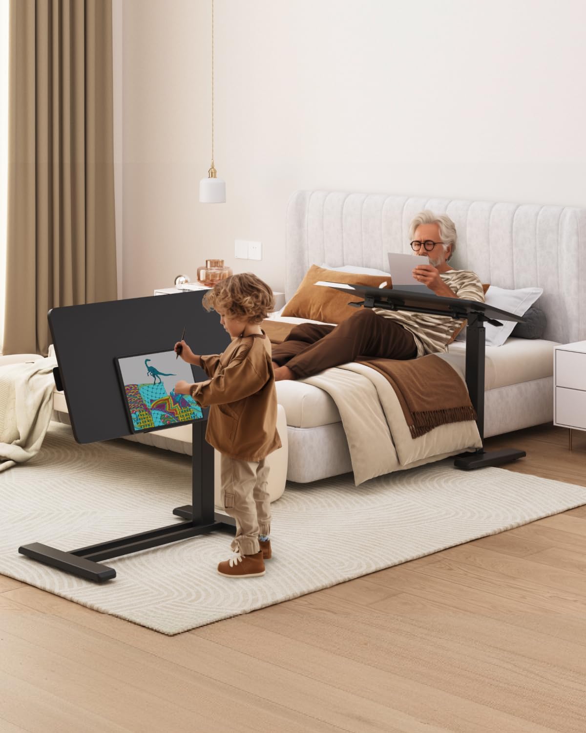 - Gas Spring Pneumatic Lift System :The Adjustable Overbed Table features a built-in gas spring pneumatic lift, enabling smooth one-hand height adjustment from 25.8" to 41.3". Perfect as a Mobile Standing Desk or Adjustable Desk, it eliminates bending or force, making it ideal for ergonomic work or relaxation near beds or sofas.