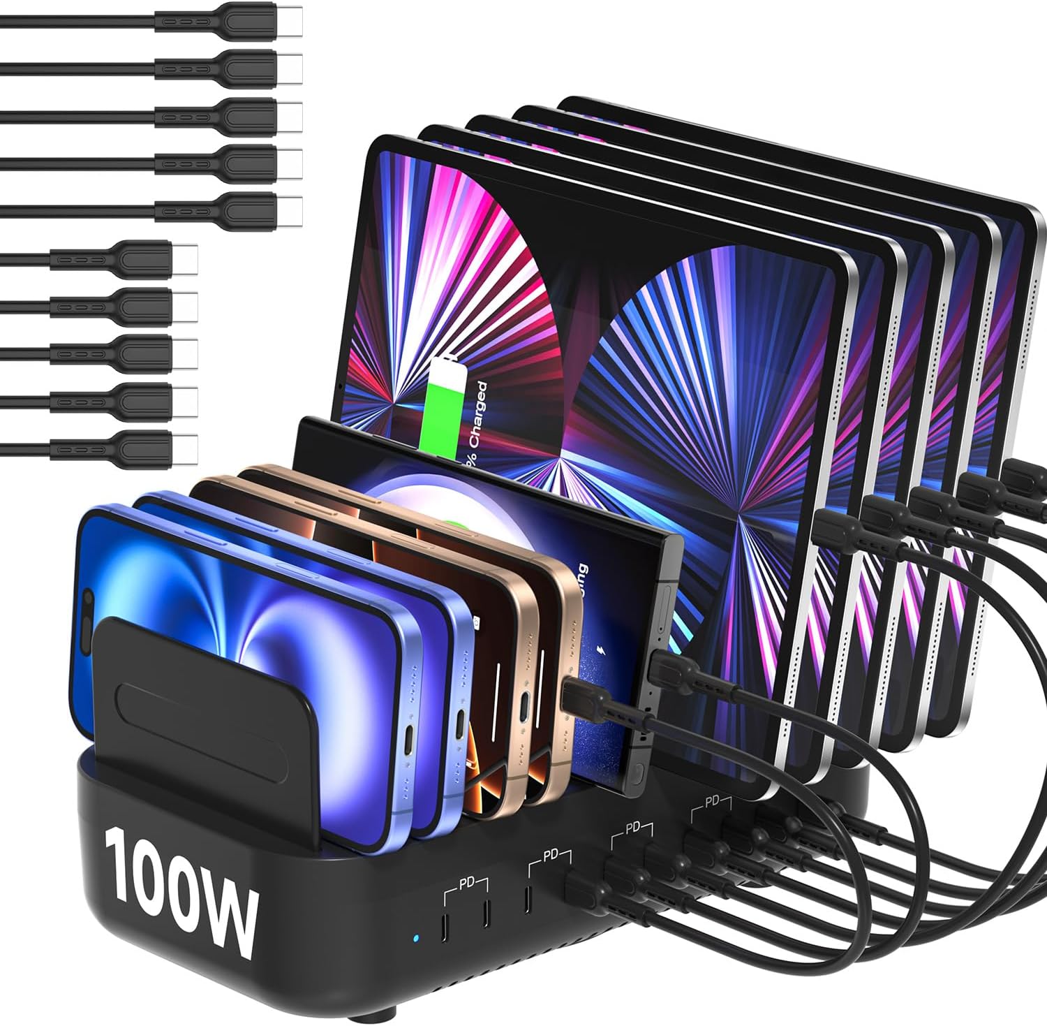 - ă10-Port Charging Station Organizeră Unlike charging stations with only USB-A ports, our multi-device charging station features 10 USB-C ports, delivering a total output of up to 100W. It can efficiently store and charge up to 10 devices simultaneously. This multi charger station helps eliminate messy cables and multiple wall chargers, keeping your desk neat and organized.The device comes with 10 USB-C to USB-C cables, so you don't need to purchase additional cables.