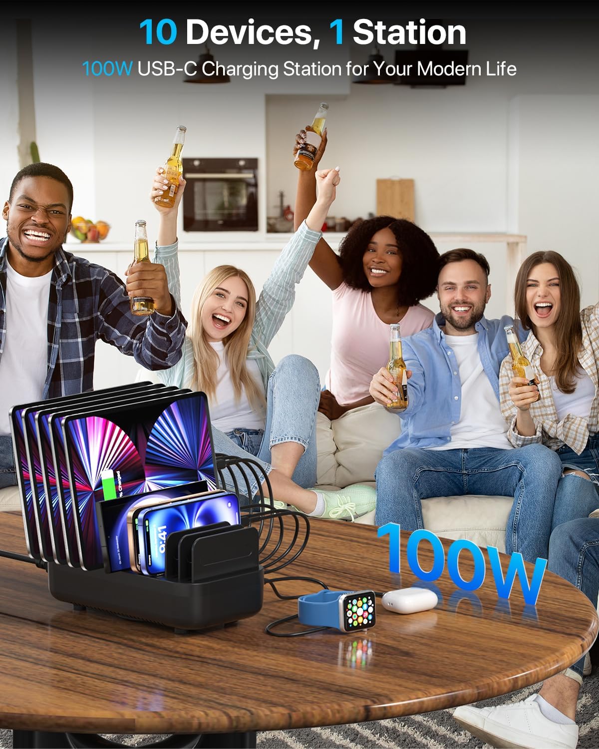 - ăWide Compatibilityă The fast charging station is compatible with a variety of devices, including Apple and Android phones, tablets, headphones, Kindles, switches, smartwatches and more. Itâs ideal for use in homes, offices, schools, restaurants, hotels, and churches.Letâs embrace a new lifestyle with this product!