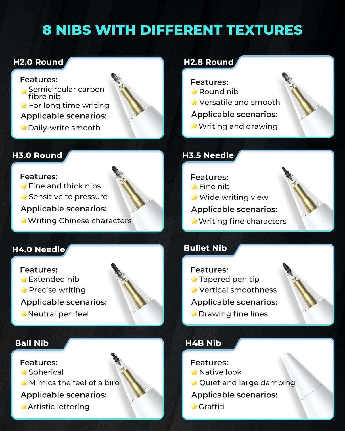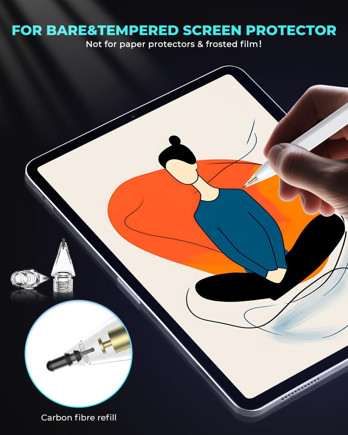 - UPGRADED 8-PACK CARBON FIBER NIBS: Get 8 durable replacement tips crafted from premium carbon fiber composite. Perfect for extended use on bare iPad screens and tempered glass protectors(Note: Not recommended for use with paper-like screen protector and matte screen protectors)