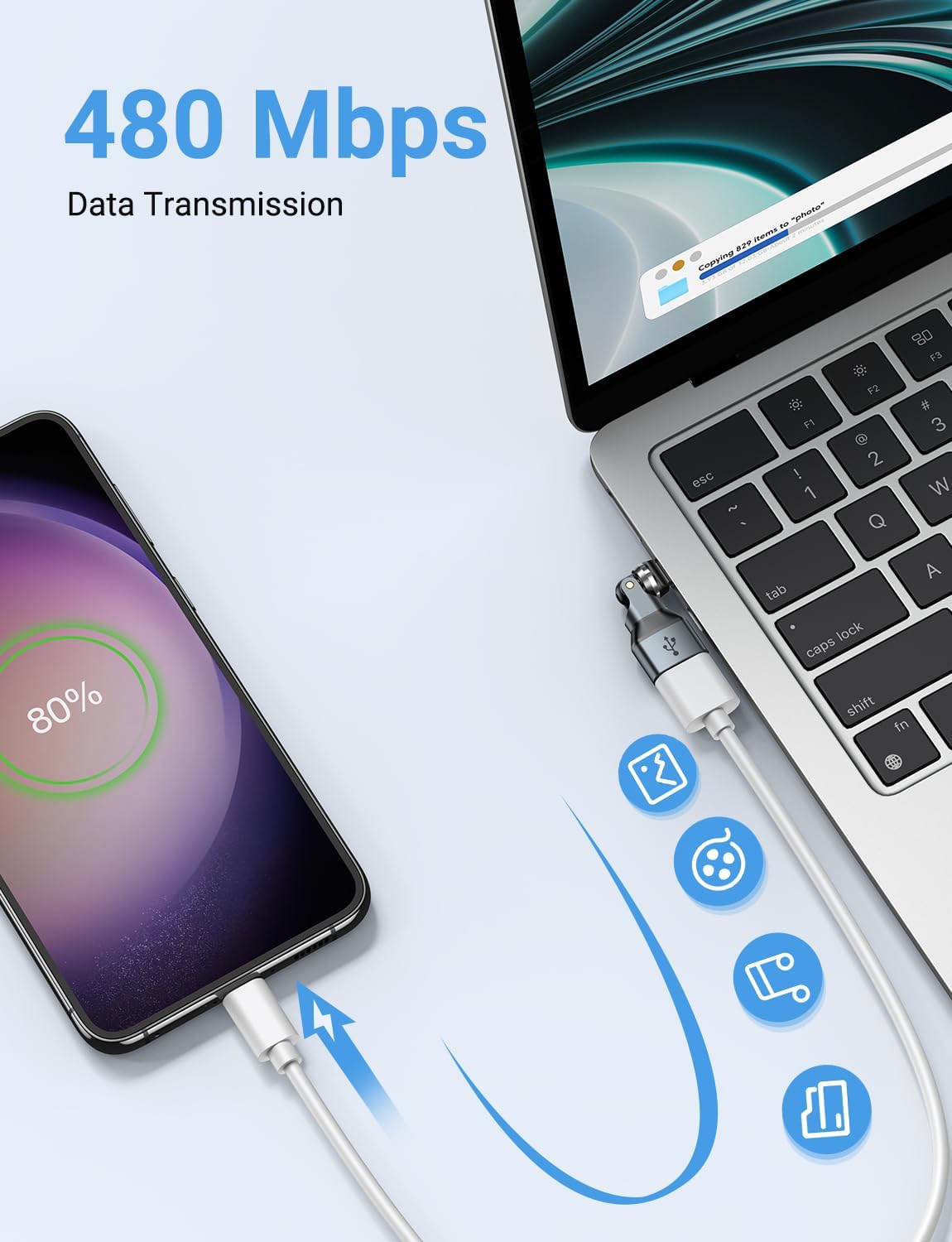 - 【Data Transfer Up to 480 Mbps and Charge】By supporting USB 2.0 and OTG. Experience the power of high-speed data transmission with our USB-C to USB adapter, achieving speeds of up to 480 Mbps. This allows you to quickly sync photos, videos, and essential files in a fraction of the time, ensuring that you spend less time waiting. Whether you’re transferring or backing up important documents, this USB-A to USB-C adapter guarantees efficient performance. It also supports up to 2.4 Amps of power output for charging your devices.