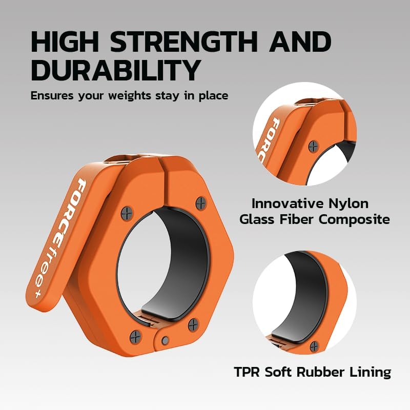 - šš¢š š” ššš«šš§š šš” & šš®š«ššš¢š„š¢šš²: Forcefree+ Barbell Clamps made of high quality innovative nylon and glass fiber composite, outperforming traditional ABS collars. This advanced material withstands heavy loads and ensures long-lasting stability and safety for your toughest workouts. Weight collars long-lasting and durable, very suitable for weightlifting, high lift, Olympic weightlifting, bench press and other strength training.