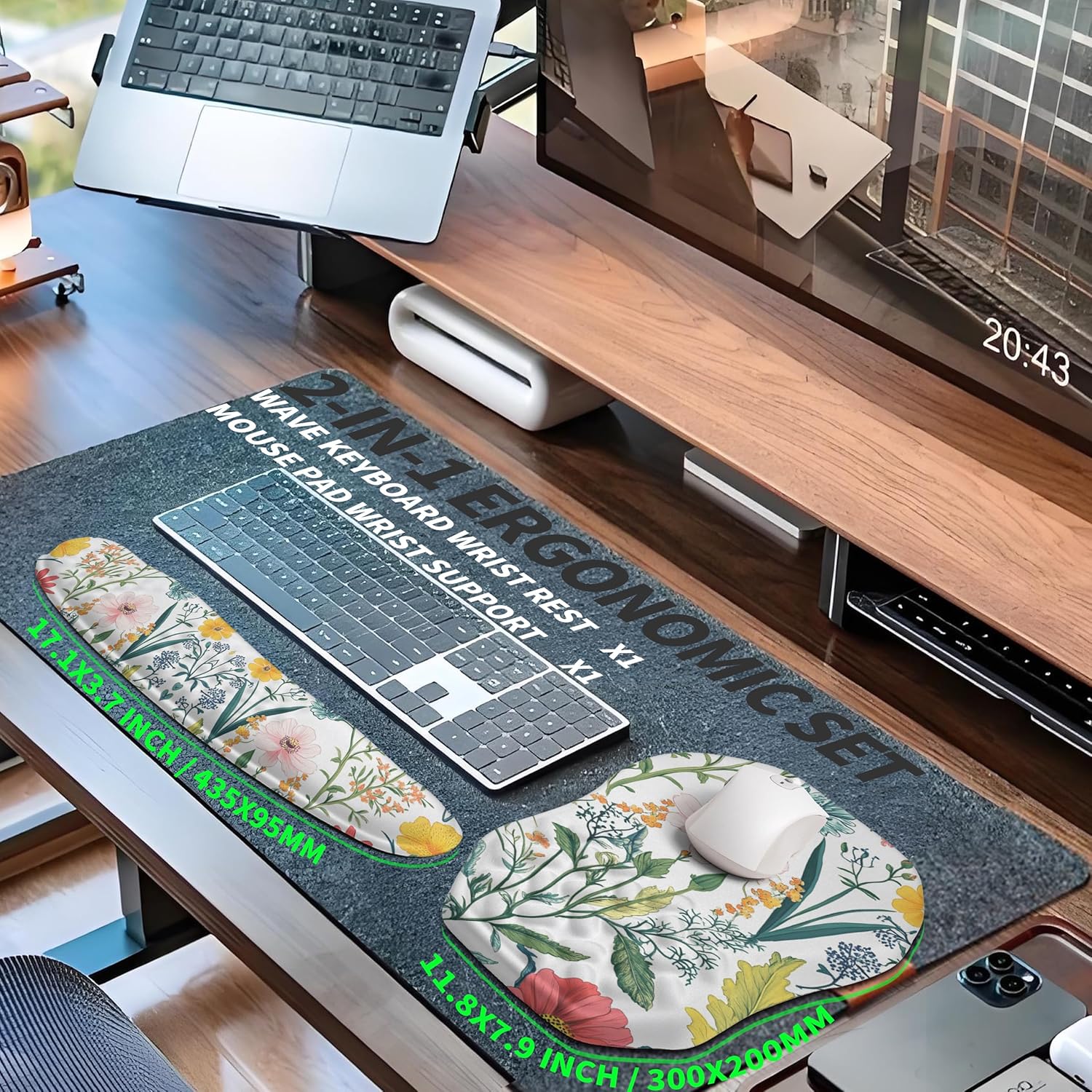 2-in-1 Ergonomic Set, Wave Keyboard Wrist Rest and Massage Slope Mouse Pad Wrist Support, Rebound Memory Foam for Relieve Carpal Tunnel Syndrome and Wrist Pain (Pink Flowers)