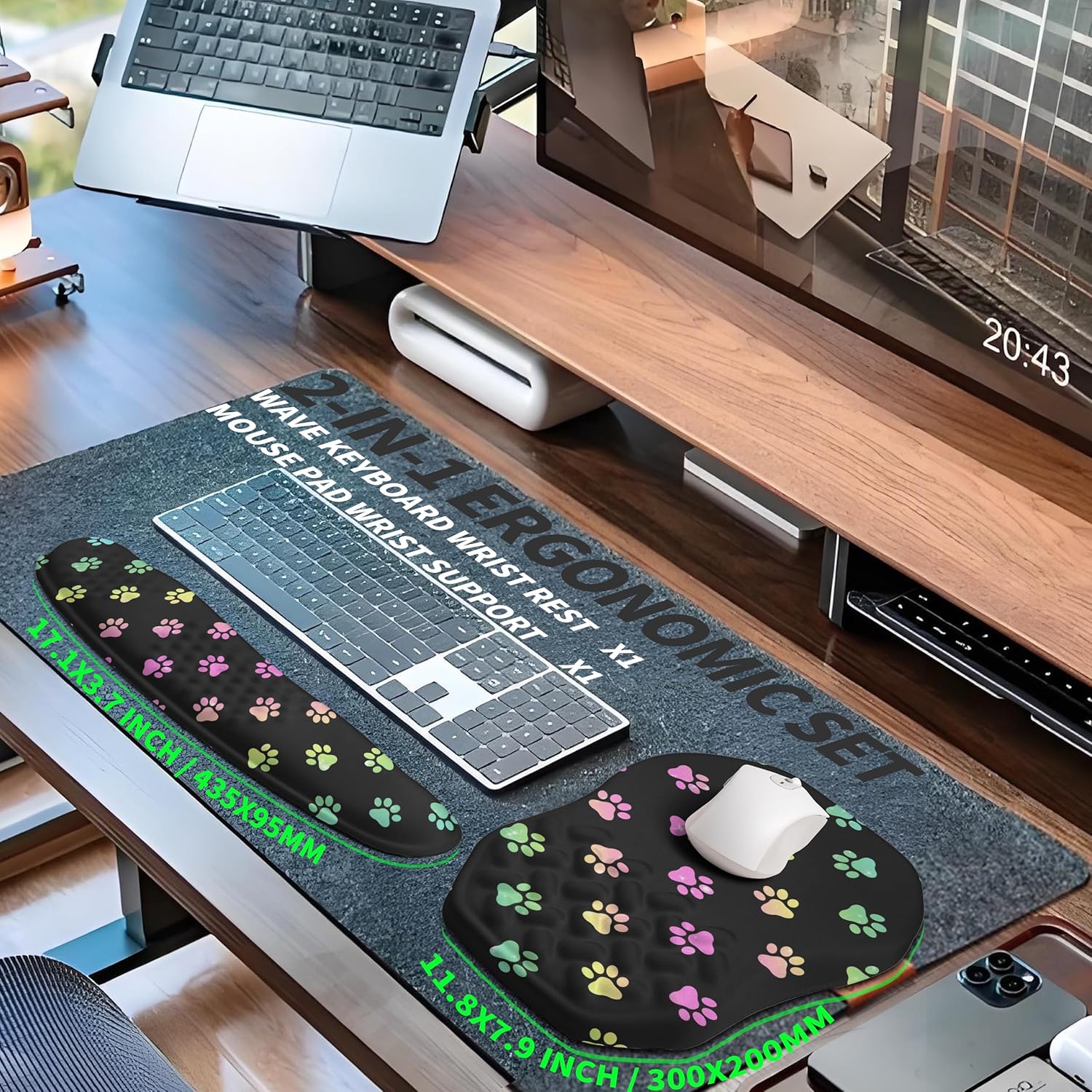 - 【Ergonomic Set】Wave Keyboard Wrist Rest x1(17.1x3.7 inch, 435x95mm) and Massage Slope Mouse Pad Wrist Support x1(11.8x7.9 inch, 300x200mm), ergonomic curvature design optimization, more in line with the natural position of the shoulder during work, alleviates carpal tunnel syndrome and wrist pain