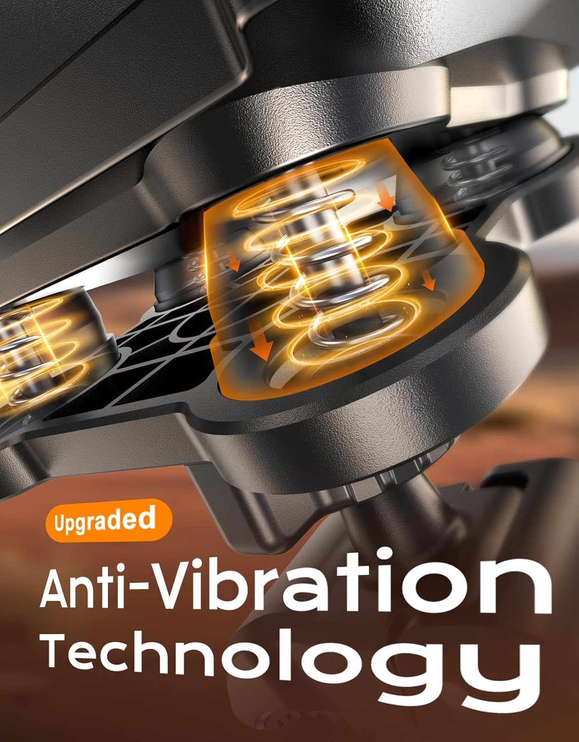 - [Ultimate Shockproof Protection] This bike phone holder boasts an advanced 4-point anti-vibration system with premium shock-absorbing springs absorbs engine vibrations that effectively neutralize engine vibrations. The corners are equipped with ultra-cushioned rubber to prevent scratches and further mitigate shock impacts. Your phone stays steady on any terrain - from city streets to off-road adventures!