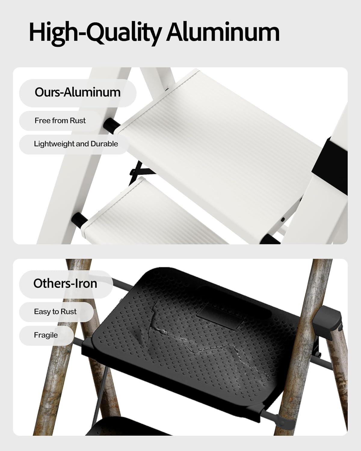 Taranta 3 Step Ladder, Lightweight Aluminum Step Stool with Convenient Handgrip, Folding Ladder with Anti-Slip Pedals, 330lbs Capacity Stepladder for Home, Office, Kitchen - White