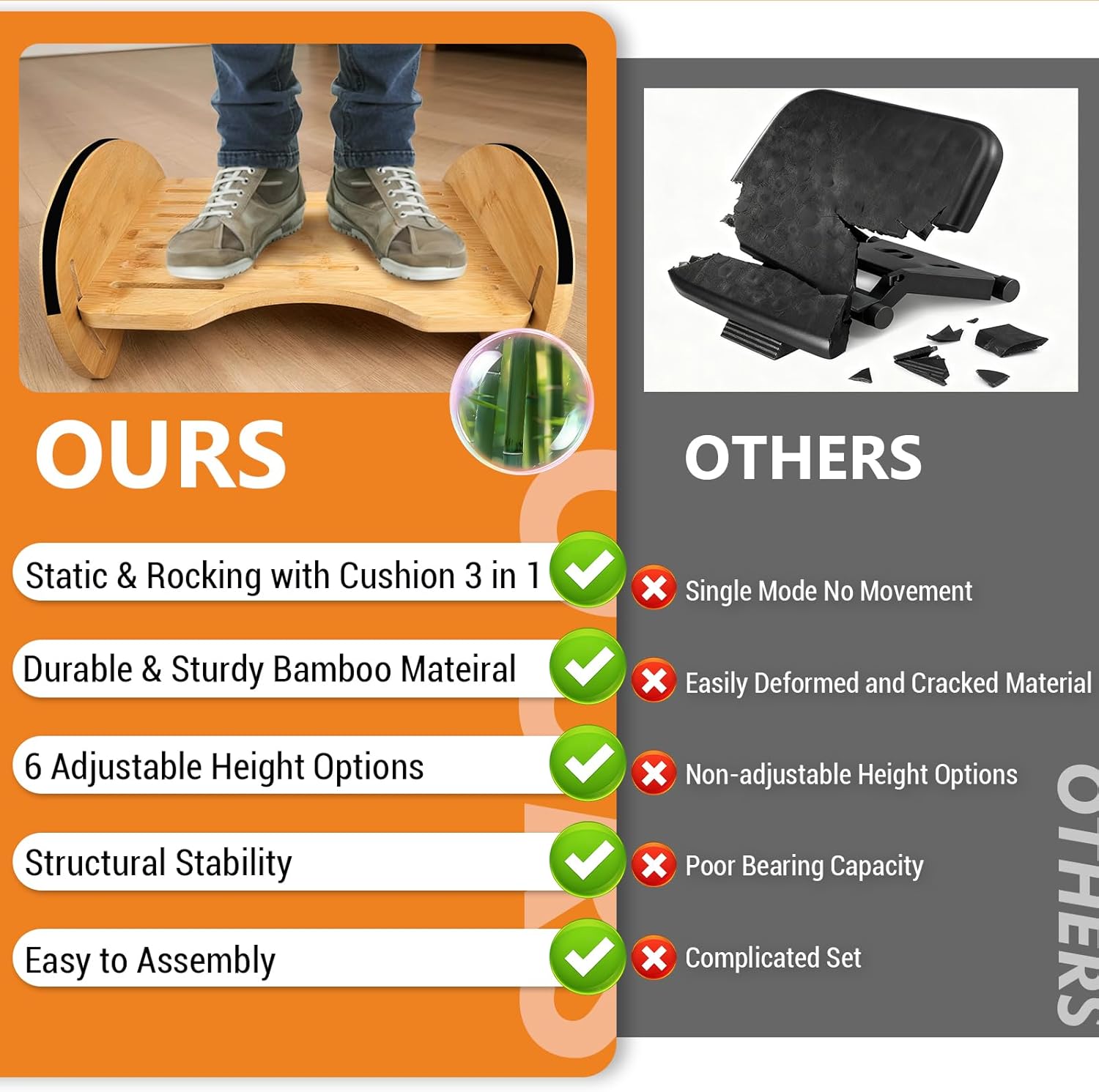 Bamboo Foot Rest for Under Desk at Work - 3-in-1 Reversible Rocking Desk Footrest with Foam Cushion Pad and 6 Adjustable Heights, Ergonomic Foot Rest with Washable Cover for Home, Office and Gaming