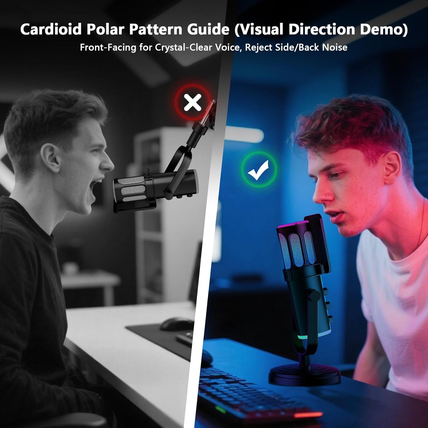- RGB and One-touch Mute:Cyclic RGB lights on the microphone for PC enhances your glowing rig for a carnival atmosphere, immersing you in the intense game arena.Immediately silence the USB microphone with a tap, preventing emotional outbursts to maintain a positive team atmosphere