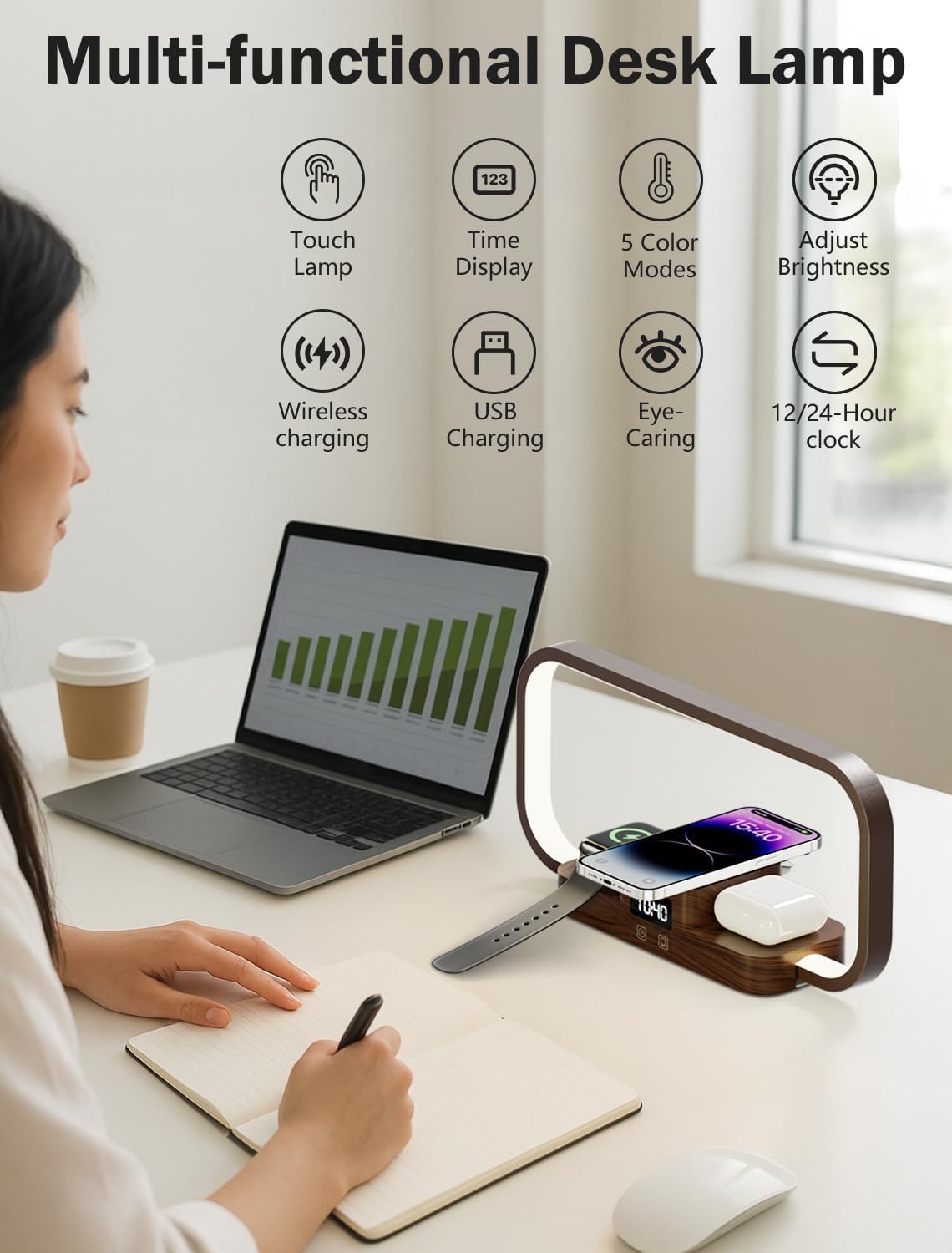 LED Bedside Lamp with Wireless Charger, 3 in 1 Touch Control Bedside Lamp, 5 Color Mode & Dimmable, Desk Lamps with Clock for Nightstand, Table Night Lamp for Bedroom, Gifts for Women, Men, Friends