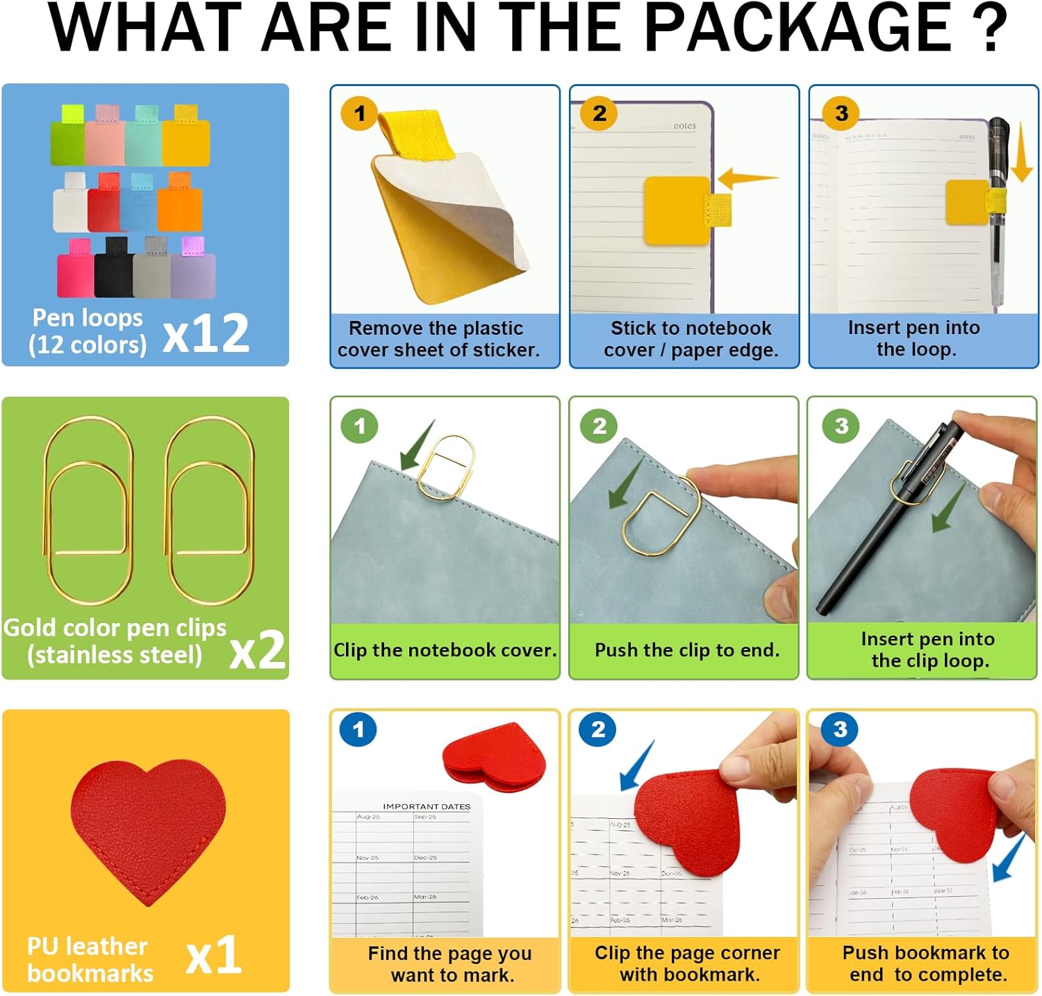 - 【COMBO With Pen Clips & Bookmarks】Beside the pen loops, 2 pen clips provided for more pen holding flexibility. Also 1 leather heart bookmarks are in the set for more reading, writting convenience.