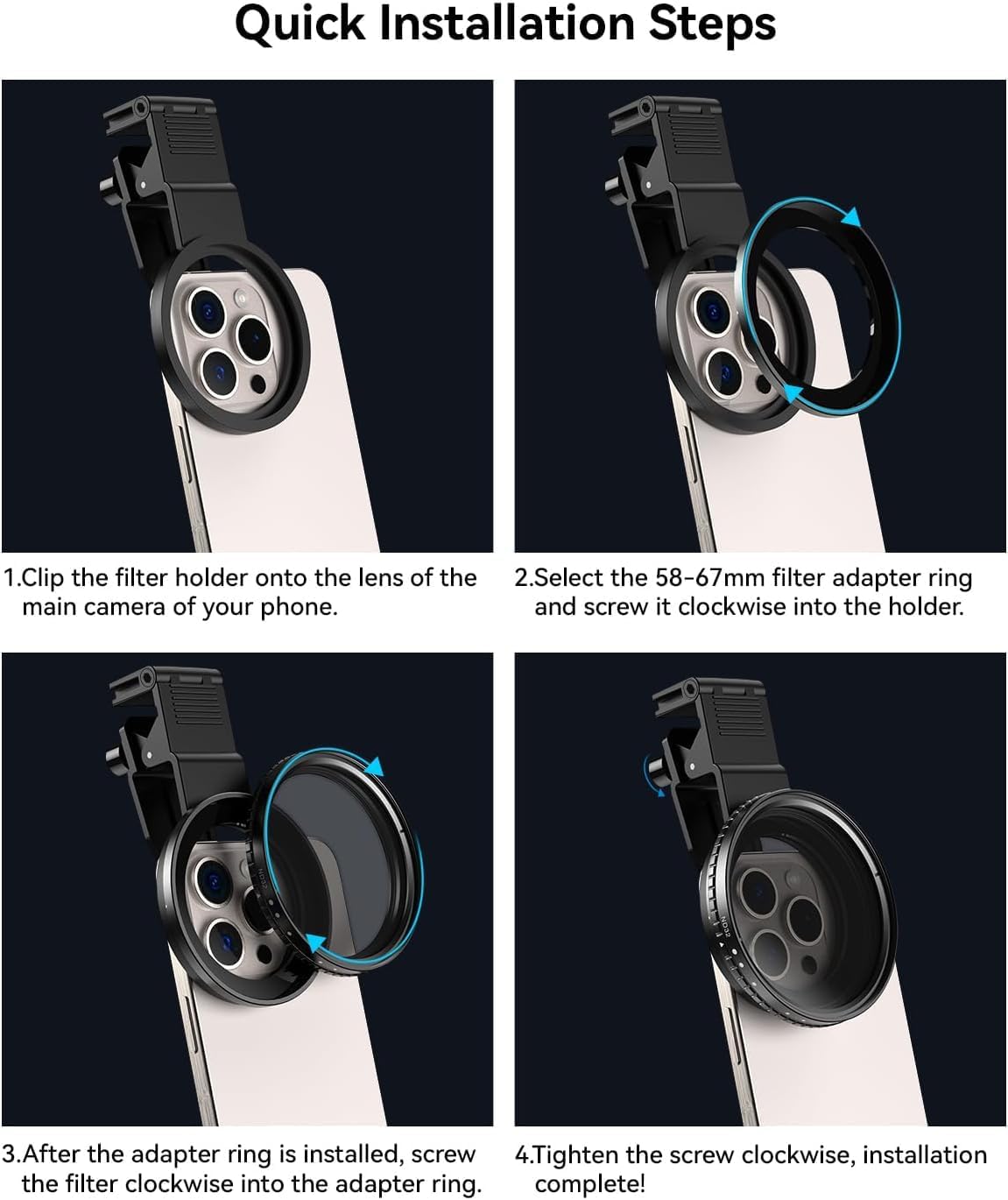 - Durable Aluminum Alloy Frame & Smooth Rotation: Our polarizing filter is made of durable aluminum alloy, providing a robust, long-lasting design. The filter features black anodized threads with precision CNC treatment for smooth, effortless rotation and easy setup. The clipโs hand-tighten knob and soft silicone pads securely attach the filter while protecting your device from scratches