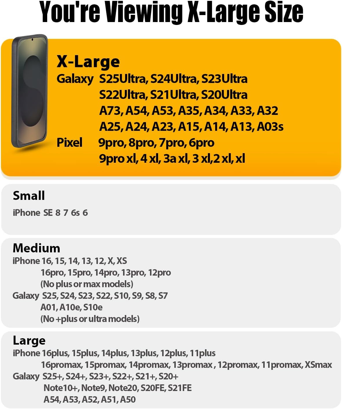 - X-Large size cell phone belt holster case is designed for Samsung Galaxy S25ultra S24ultra S23ultra S22ultra S21ultra S20ultra A73 A54 A53 A35 A34 A33 A32 A25 A24 A23 A15 A14 A03s, and also perfect for Google Pixel 9pro 8pro 7pro 6pro 9proxl 4xl 3axl 3xl 2xl xl. The holster pouch interior measures: 6.75" x 3.35" x 0.6".