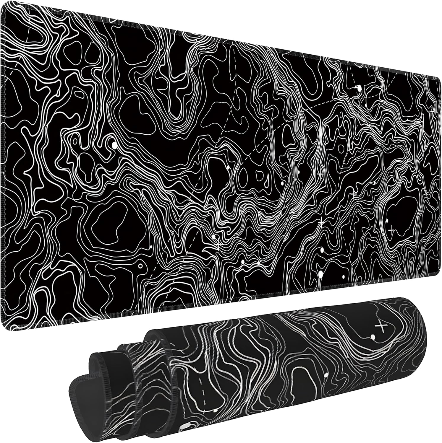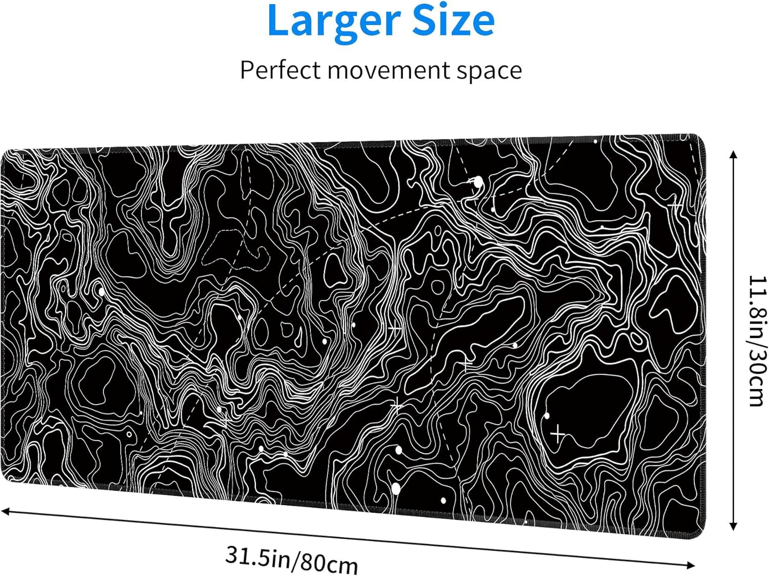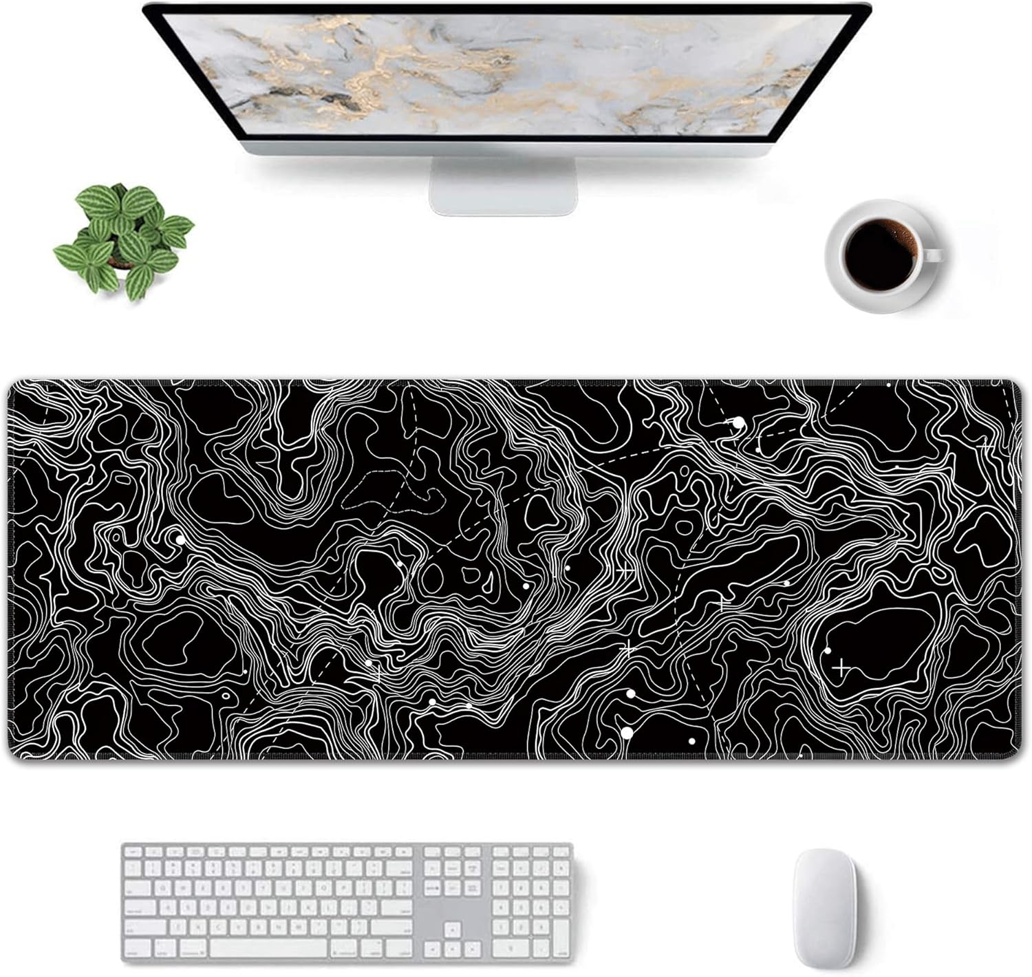 Black with White Topographic Line Large Mouse Pad,Gaming Keyboard Desk Pad,Extended Mouse Mat Non-Slip Rubber Base with Stitched Edges for Office Game Home XL 31.5"x11.8"