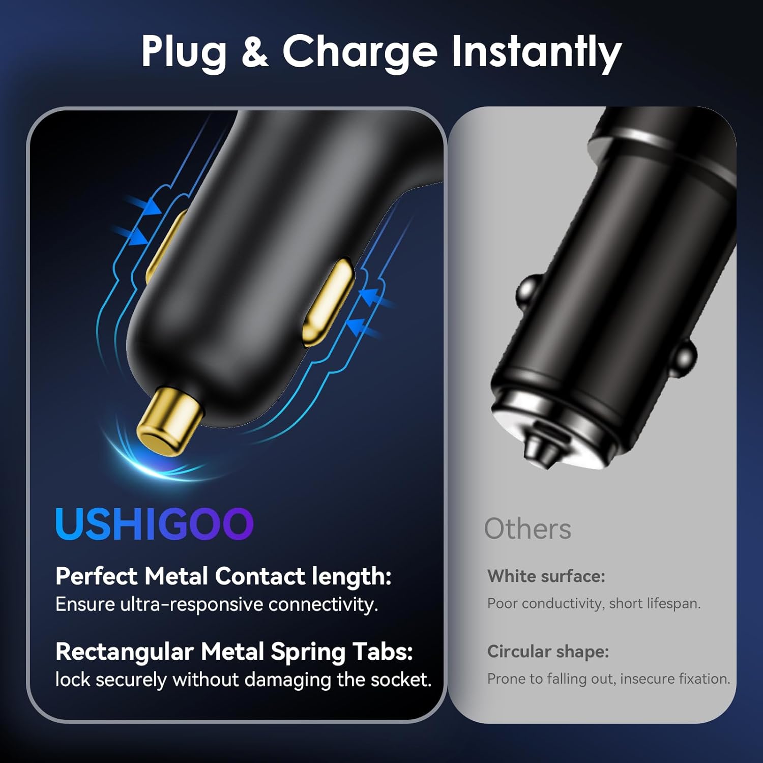 - TURE PD3.1 CAR CHARGER: USHIGOO super fast car charger with 170W total power. 140W USB C Car Charger Max Tpye C port + 30W Max Type B port delivers full-power charging with outputs of 140W/100W/65W/45W/36W/27W/15W compatible with PD3.0/QC3.0/PPS to ensure universal fast charging for iPhone 16 pro max, car charger for laptops, tablets, rapid car charger type c pd 3.1 for Samsung devices, Starlink Mini, drones, and more. Cigarette lighter adapter.