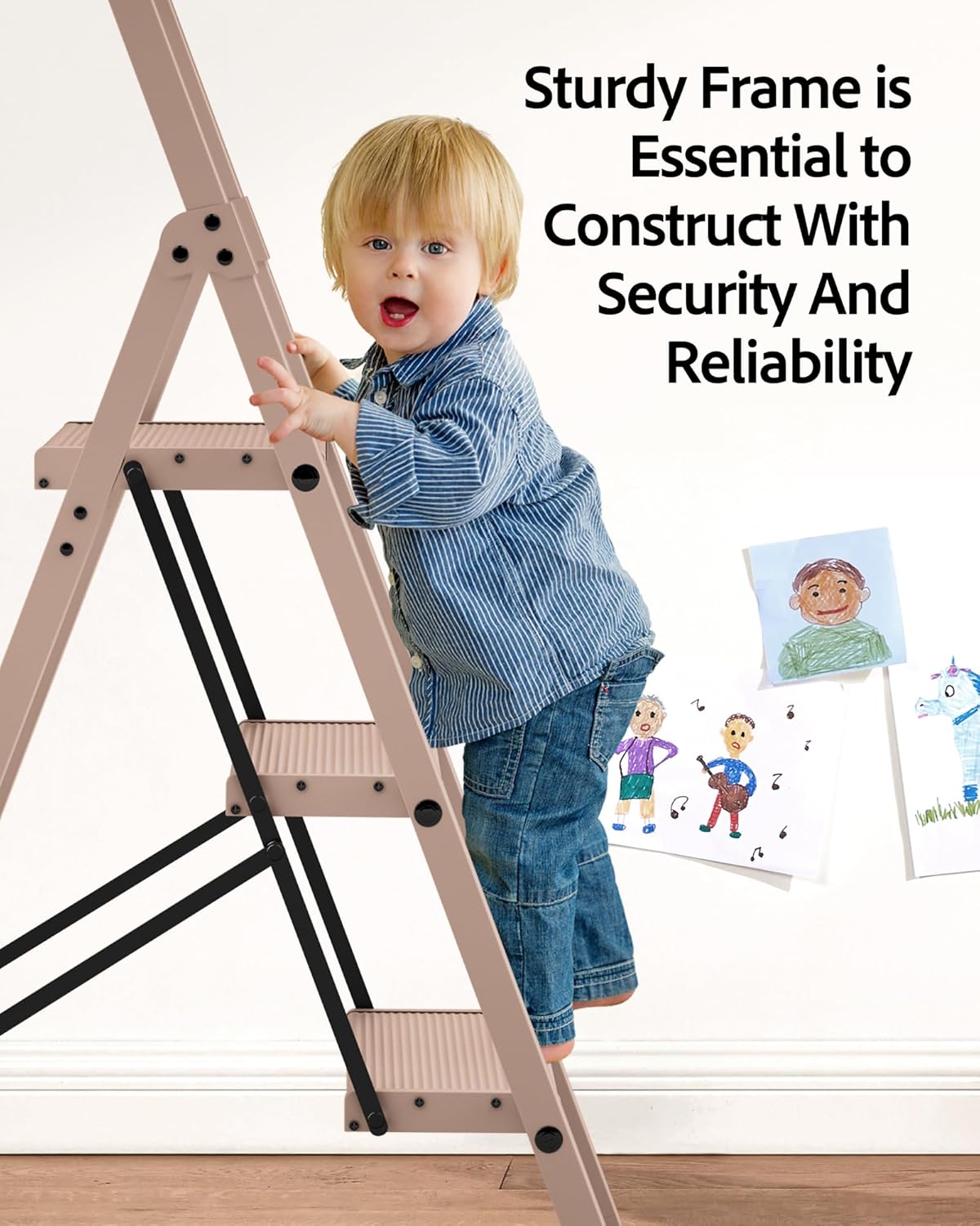 Taranta 3 Step Ladder, Lightweight Aluminum Step Stool with Convenient Handgrip, Folding Ladder with Anti-Slip Pedals, 330lbs Capacity Stepladder for Home, Office, Kitchen - Peach Pink