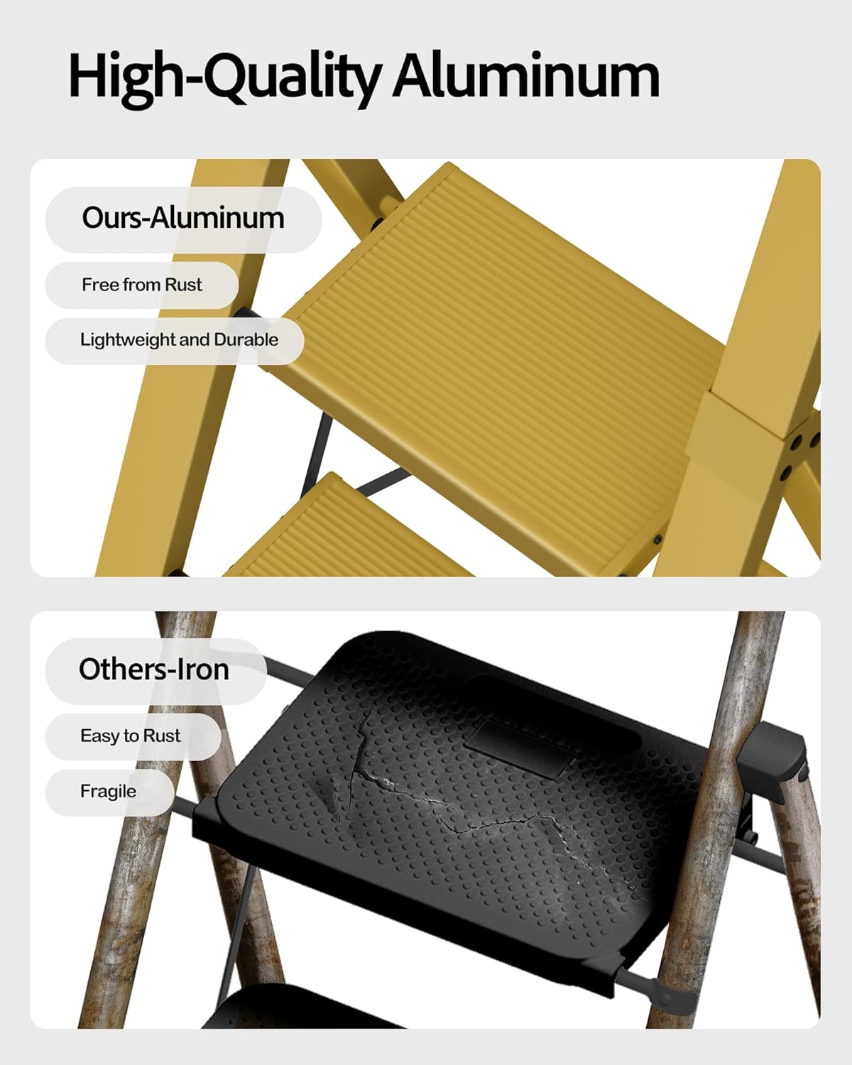 Taranta 3 Step Ladder, Lightweight Aluminum Step Stool with Convenient Handgrip, Folding Ladder with Anti-Slip Pedals, 330lbs Capacity Stepladder for Home, Office, Kitchen - Twilight Yellow