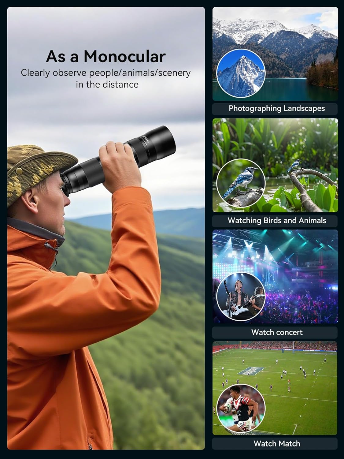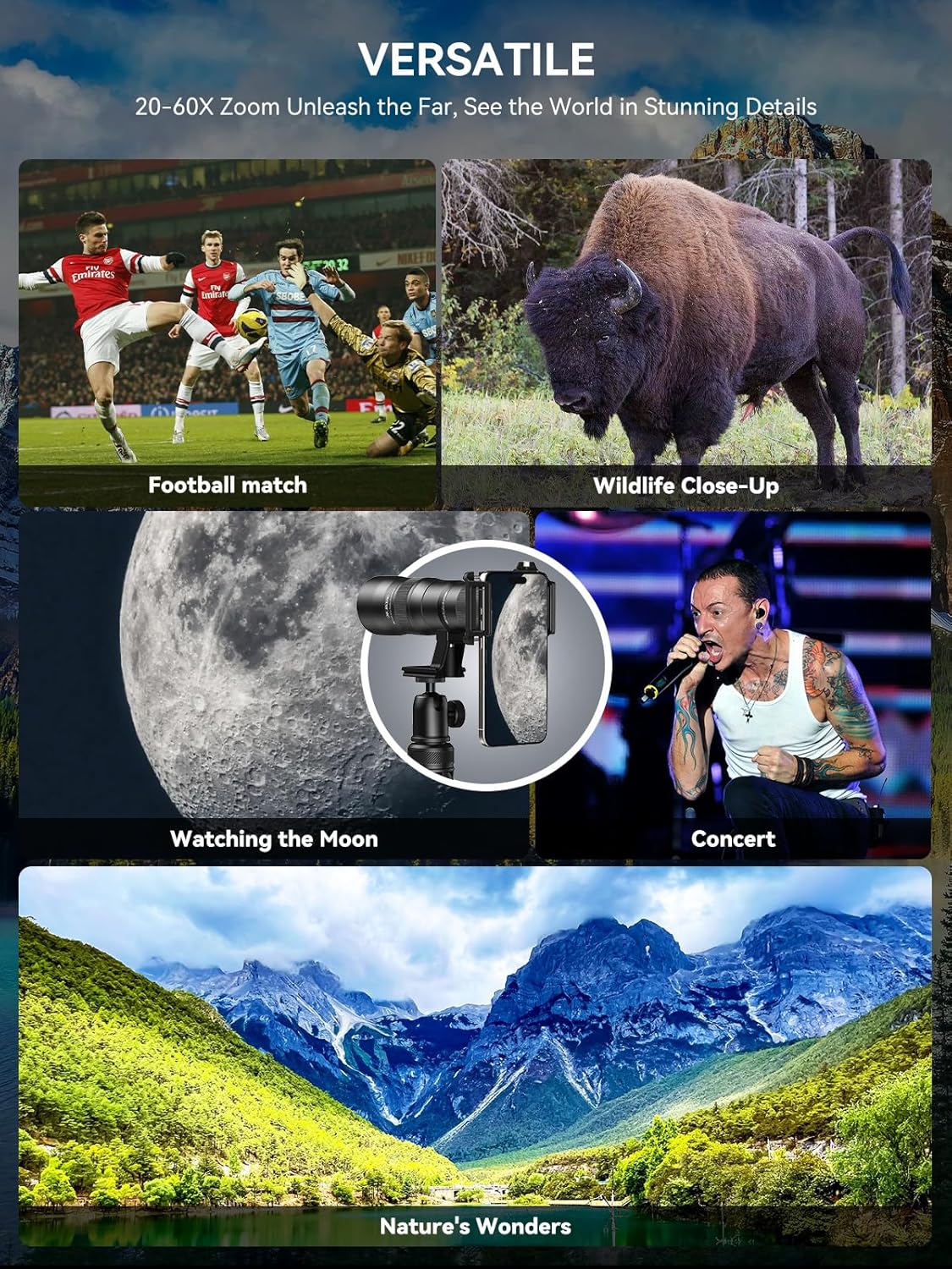 - 2 ways to use: Experience versatile viewing with our telephoto lens featuring two instant-use modes. Clip it directly to your smartphone's main camera for powerful 20-60X zoom photography and videography of distant wildlife, concerts, or lunar surfaces; or attach the eyecup to convert it into a standalone monocular telescope for real-time optical observation of landscapes and fast-moving subjectsâno electronic device required